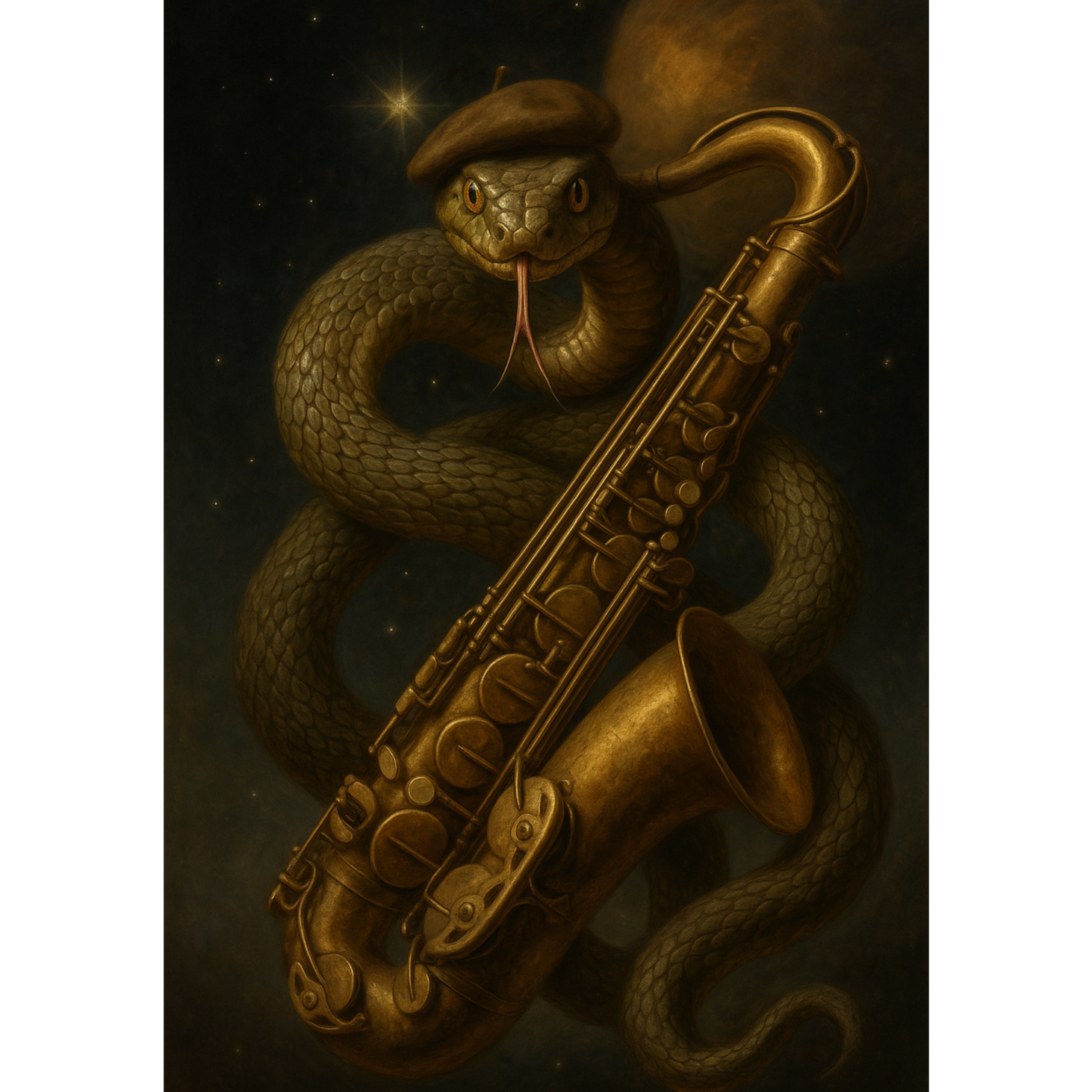 A slow, hypnotizing jazz track with pulsing, heavy textures; layered whispering snake-like vocals glide between close-mic’d non-speech syllables, sparse yet intimate, creating nurturance laced with unease, The intro sways on upright-bass pulses and sand-like rattles, long hiss-breaths swelling and retreating, The verse sinks into a low jazz groove, brushed drums whispering, rattles twitching irregularly, while serpent-speech emerges: stretched sibilants, tongue-clicks, whisper-drags, guttural exhales curling in rhythm, The chorus breathes wider as saxophone unfurls velvet lines, snake-voice hissing in syncopated bursts, punctuated by rolled tongues and moans sliding like scales across brass, In the bridge, bass walks upward as rattles swarm in tremors, snake-vocals deepen into chest rumbles and forked clicks, circling the sax in dialogue, The outro dissolves into hiss-breaths and faint rattling, one final serpentine exhale stretched into silence, leaving only the aftertaste of trance