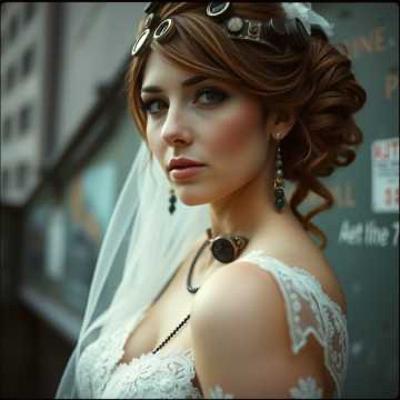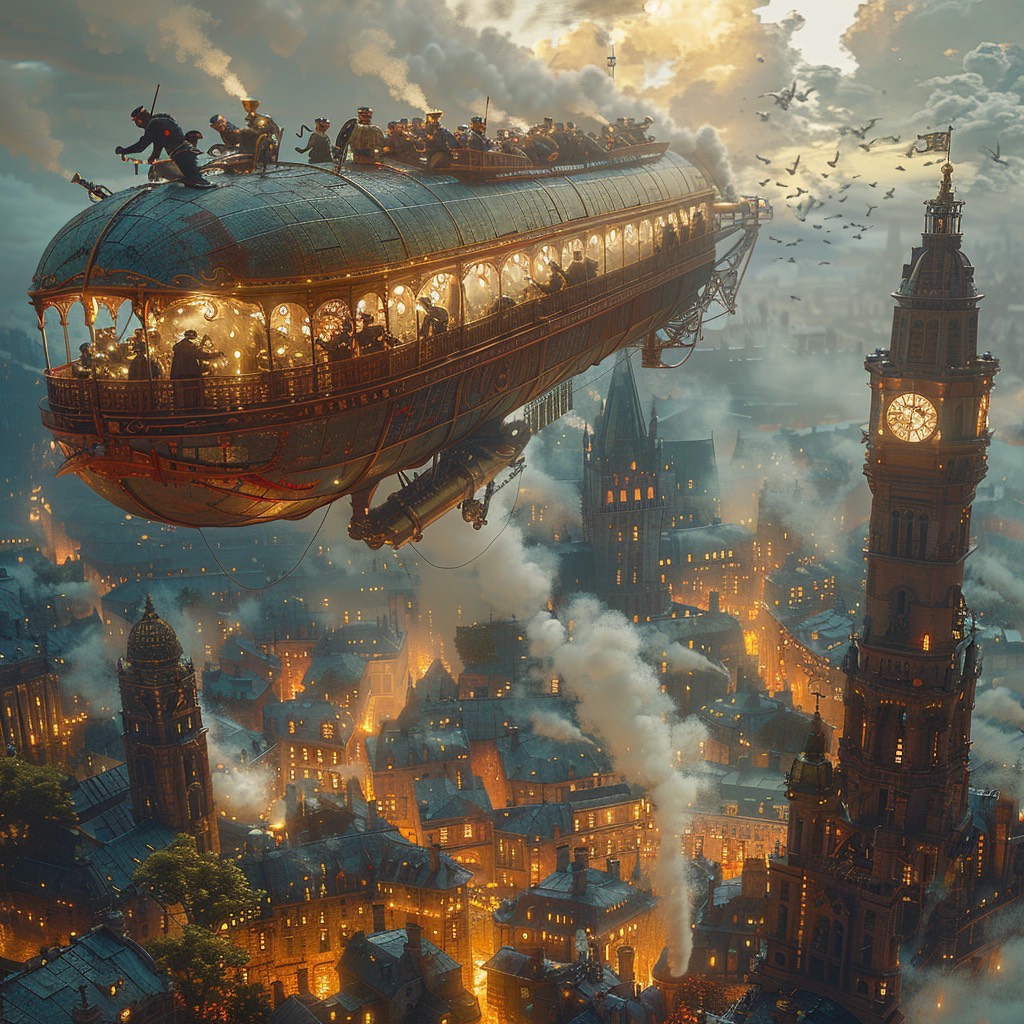 Steampunk style slow love song with varied tempo changes and edgy variety of steampunk musical instruments solos and rap turned rock house Steam Powered Giraffe like mix