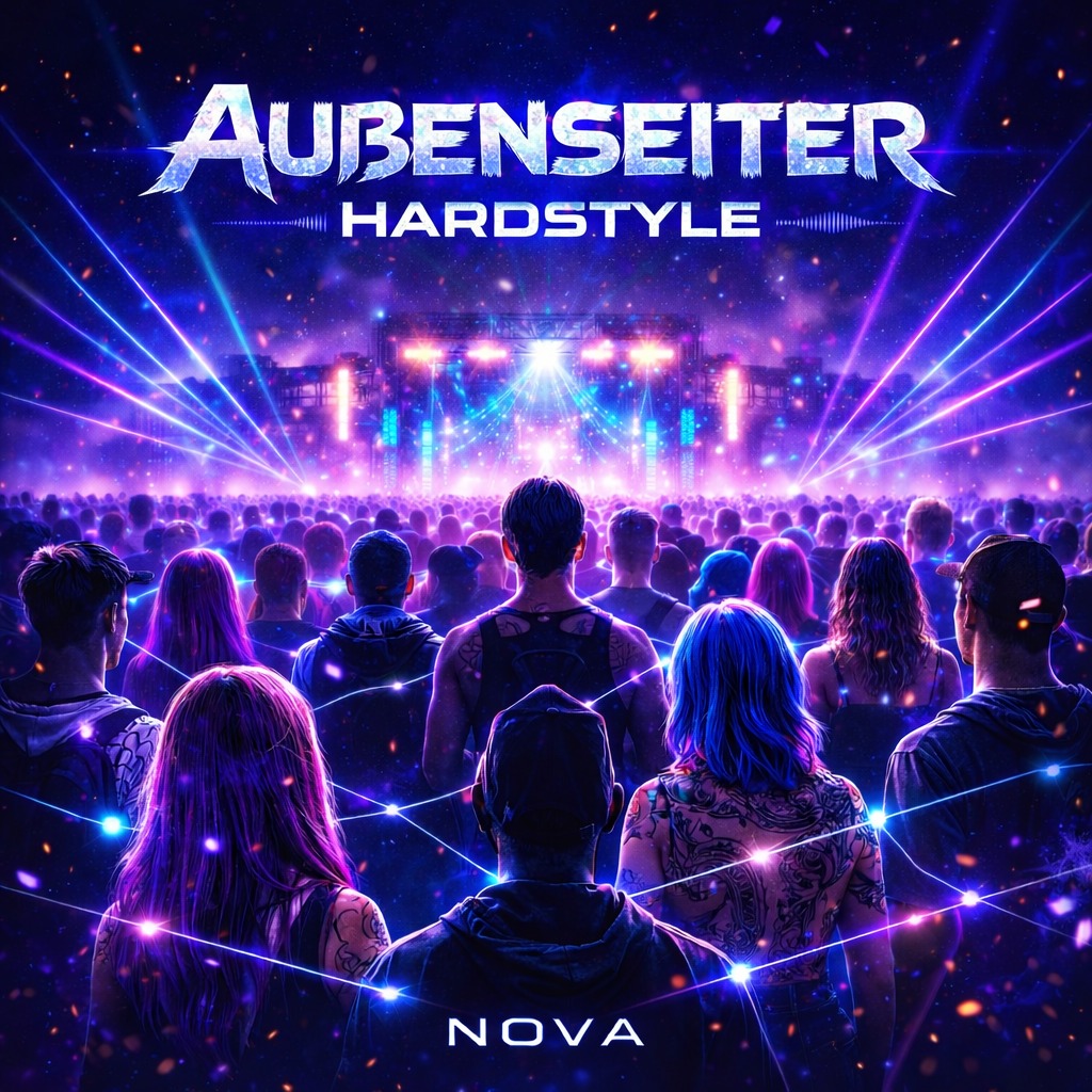 150 BPM hardstyle festival anthem with clear multi-drop structure, Dark atmospheric intro with deep sub bass and cinematic pads, Strong build-ups with snare rolls and risers leading into massive euphoric first drop with melodic lead, punchy hardstyle kick and powerful reverse bass, Energetic crowd vibe and vocal chops shouting “Außenseiter”, Second drop noticeably harder with raw hardstyle elements, distorted kick, aggressive screech layer and intense kickrolls, Emotional breakdown with piano and wide reverb pads, tension rebuild with rising pitch and snare acceleration, Final drop explosive and biggest of the track, double kickrolls, octave lead lift, heavy reverse bass and festival mainstage energy, Clean powerful mix, wide stereo image, strong low-end, professional club master