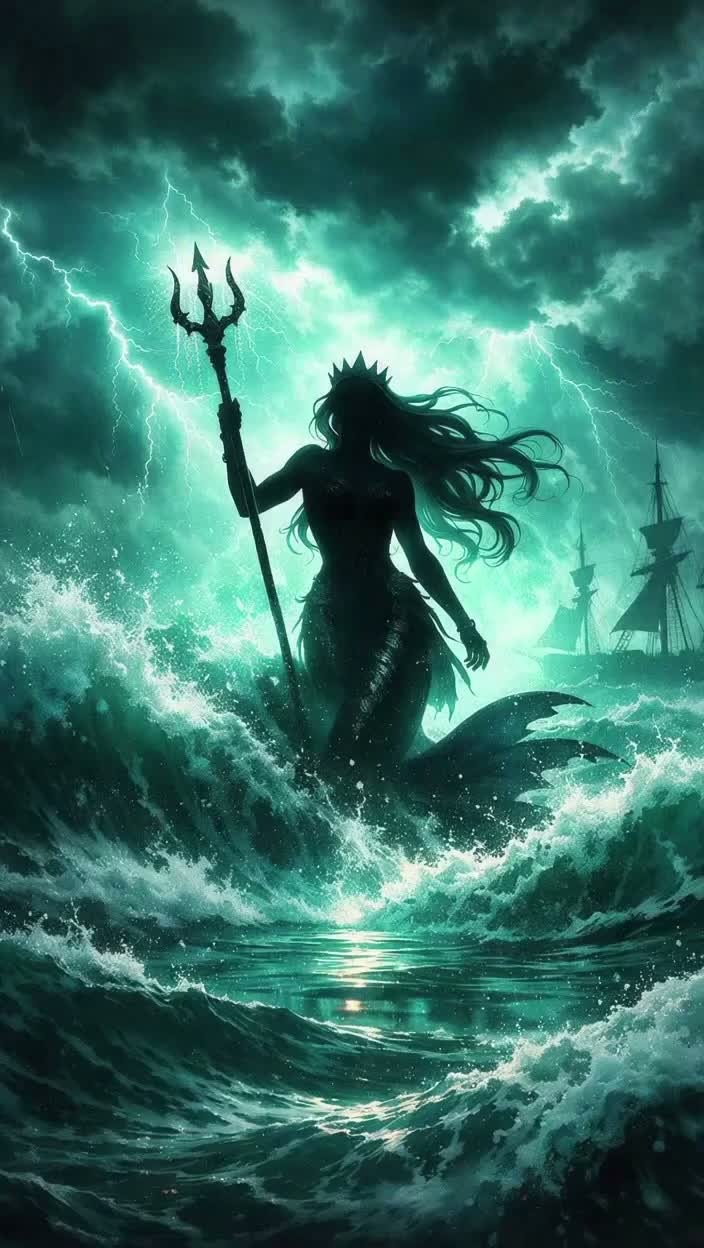 epic cinematic sea shanty anthem, 100 bpm, pirate folk soundtrack, d minor, powerful female lead vocal (confident pirate queen, no long held-notes, precise and punctuated vocals, very dignified), heavy gang vocals sailor chorus, strong call-and-response sections, stomps and claps rhythm, frame drum and low war drums driving beat, fiddle, hurdy gurdy, accordion, cello, orchestral horns and strings, deep choir pads, ocean waves and storm wind ambience, dramatic swells and pauses, quiet mystical bridge with harp and choir, then explosive final chorus with full crew chant, dark nautical atmosphere, huge reverb vocals, cinematic film score mix, triumphant maritime anthem energy