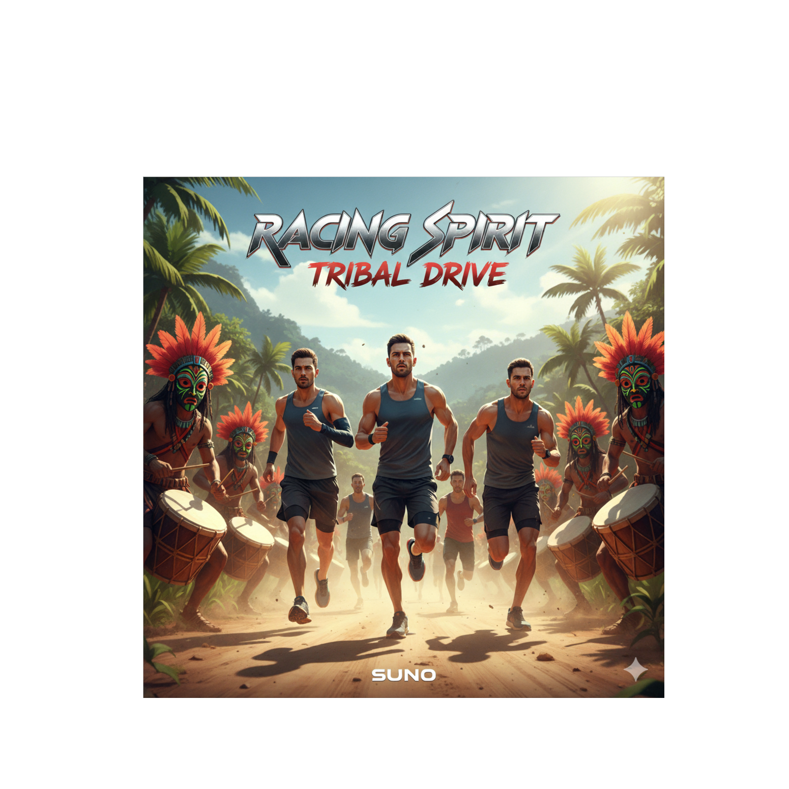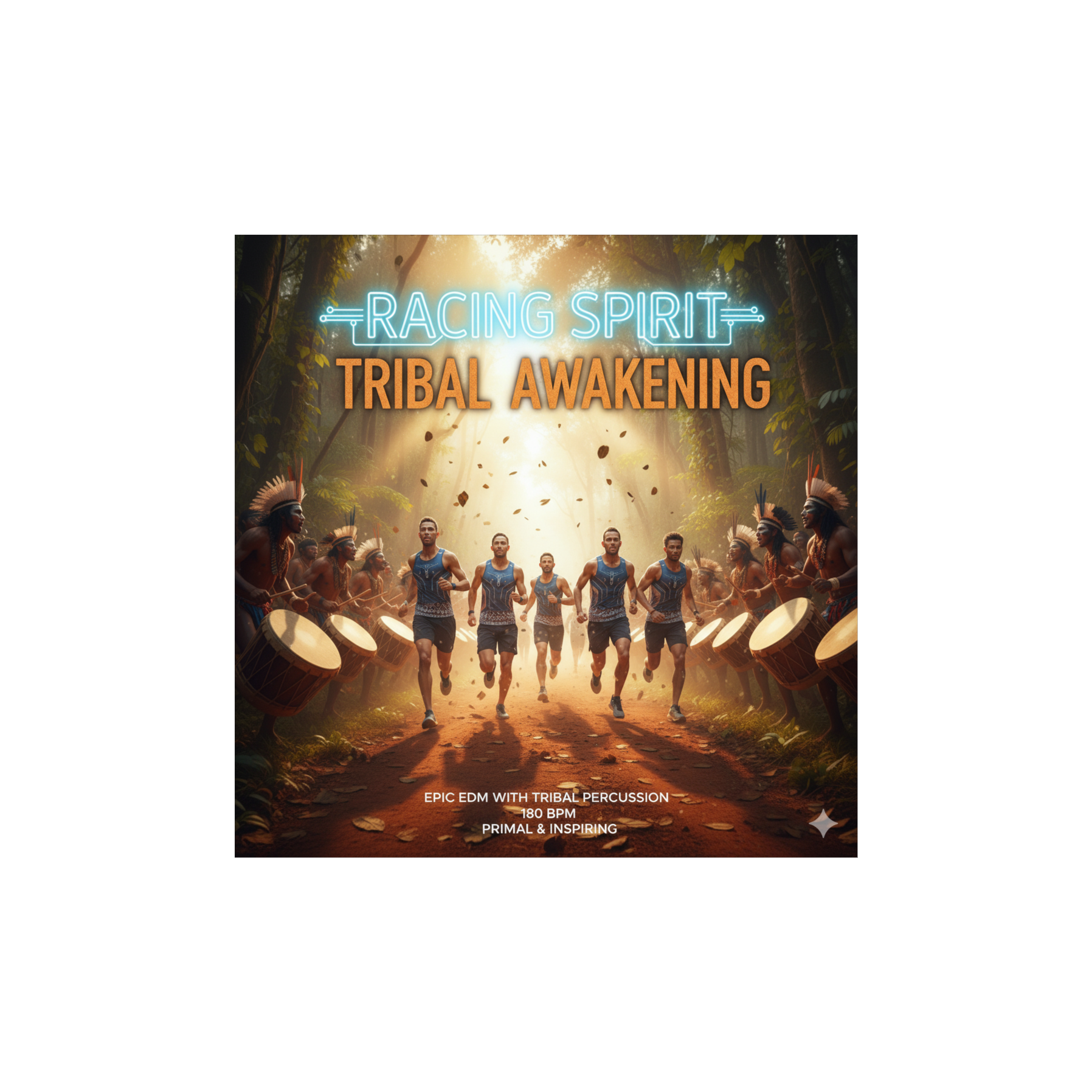 Epic EDM with cinematic intro, enhanced tribal percussion depth and powerful 180 BPM beat, Pulsating bass and euphoric arps with clear stereo separation, Soaring leads and dynamic percussive fills, maintaining sustained high energy, Warm, wide mix with deep low-end and crystal highs, Full version 3:50 total, suitable for running and training sessions, Victorious, primal, and inspiring