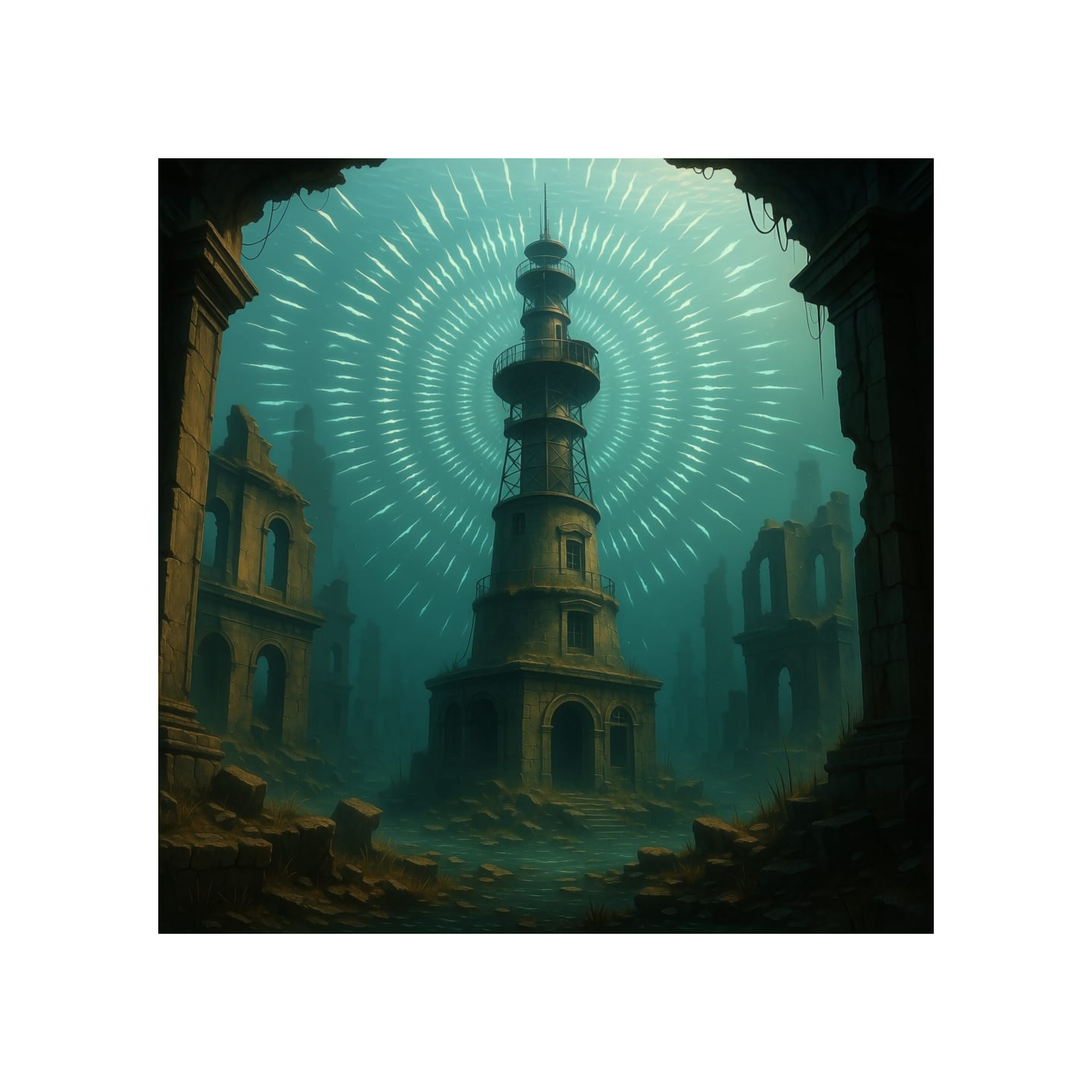The piece opens with distant, lo-fi static and detuned radio crackle, as if tuning an old 1930s set underwater, A band-passed, warbly sermon emerges—male voice, ribbon mic texture, echoing amidst gentle hiss and intermittent dropouts, Underneath, a low looping chant—“Notha-’zul… ehn-’ka-tha… zho’omra…”—is pitch-shifted and glides between speakers, evoking sonar, Pulses of filtered reverb and atmospheric pressure swells build dread, with brief choral fragments bleeding through as if from a sunken chapel’s haunted recesses