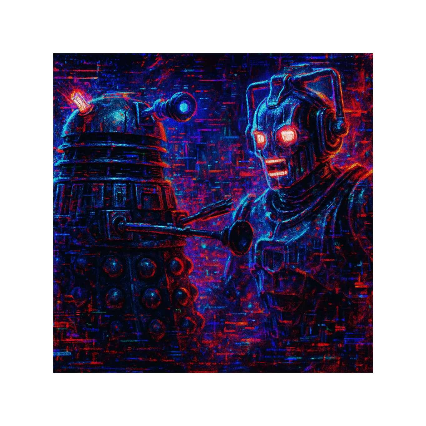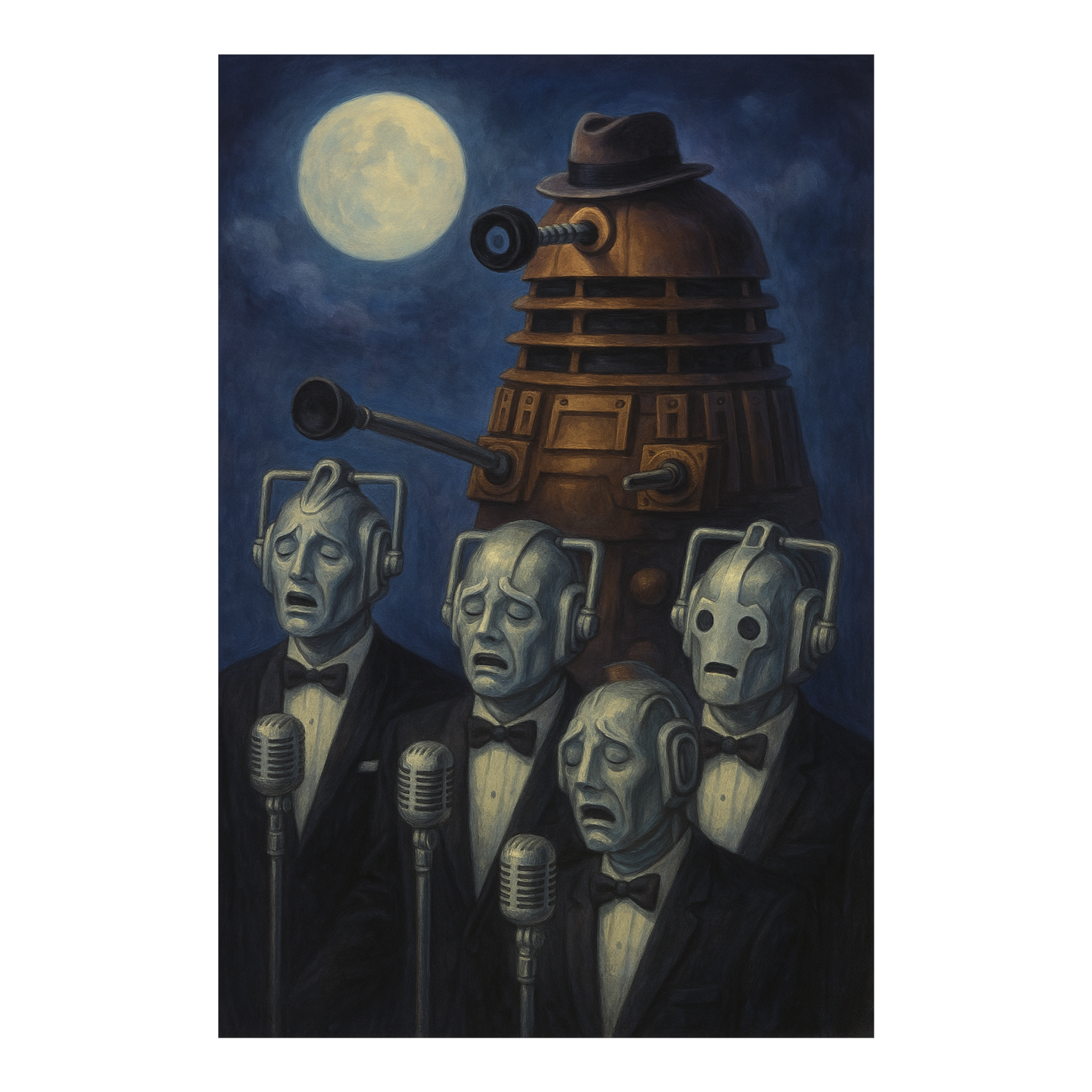 Create a retro 1950s-style doo-wop ballad titled “I Saw a Cyberman Cry, ” The song should have rich vocal harmonies, soft echoing guitar, and a sentimental, melancholic tone, It’s sung from the perspective of a Dalek reflecting on seeing a Cyberman shed a tear—an impossible moment of emotion, Use classic doo-wop structure with call-and-response background vocals and romantic crooner delivery, Include lyrics like: “I saw a Cyberman cry… a silver tear fall from his eye, ” and “If even he can feel regret… then what does that mean for me?” Add a whispered robotic outro for contrast, The mood is ironic, bittersweet, and strangely beautiful