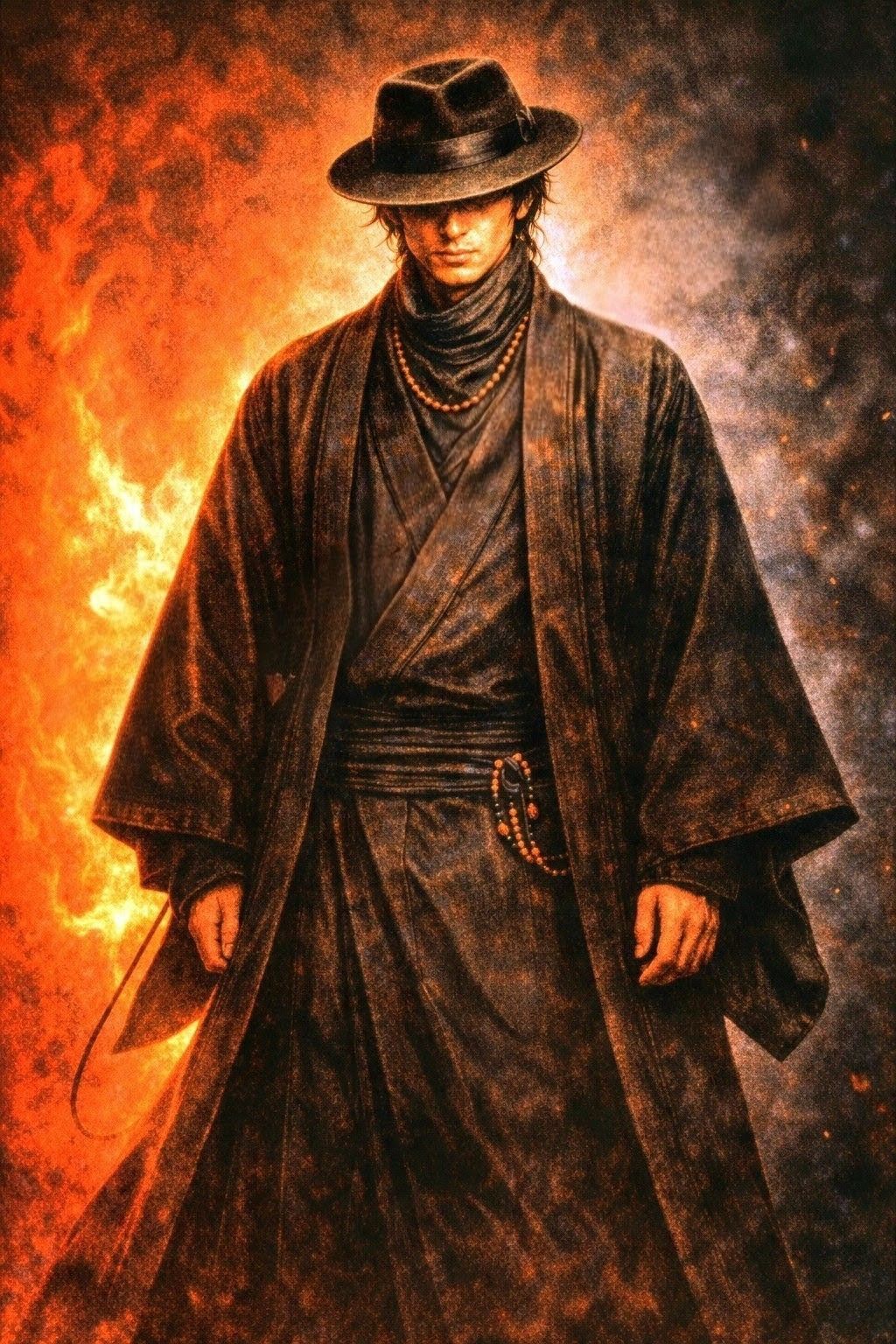 Japanese Rock, Wa-Rock, Male vocals, Powerful and dramatic, Heavy taiko drums, Shamisen riffs, Electric guitar fusion, Dark atmosphere, Yokai folklore theme, Forbidden boundary concept, Mysterious and ominous, Traditional meets modern, BPM 140, Epic and haunting, Ancestral wisdom theme, Supernatural tension