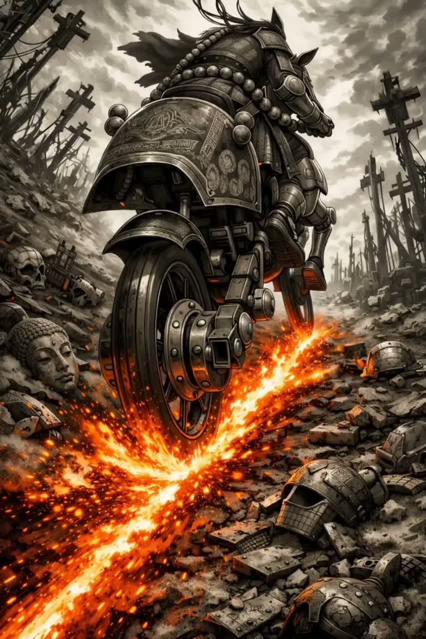Shamisen is the dominant lead motif, Taiko is the rhythmic core; modern drums lightly reinforce with double-kick, Distorted guitars are wide and restrained; heavy bass follows taiko, Bridge: shakuhachi alone (airy, solemn) → drum roll → full band, Intro/Outro: wind, metal, hoof, engine SFX with ritual tone, Vocals: