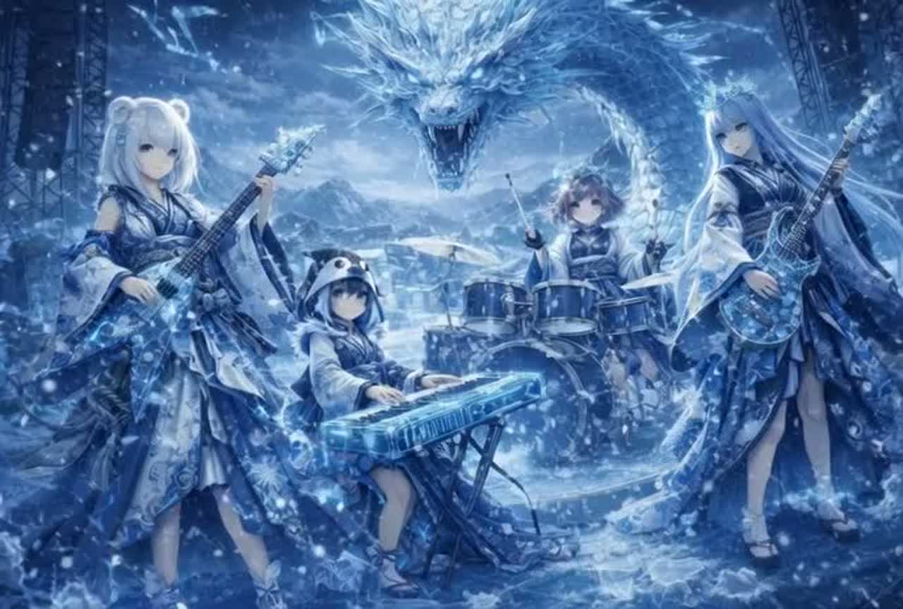 A Japanese-style rock track inspired by the awakening of an ice-and-snow themed Eastern dragon tearing through a silver stormy night sky, featuring a cold, heavy low-end ice guitar with sharply distorted yet crystalline tone carving serpentine riffs, the picking precise and brittle like shattering icicles, drenched in deep delay and reverb to create a frozen, vast soundscape, while shamisen plays aggressive percussive riffs in tight unison with the guitar, koto performs rapid tremolo and dramatic glissandos to paint the flow of blizzards and the dragon’s flight path, shakuhachi resonates in the low register with breathy, trembling long tones evoking the dragon’s roar across the sky, taiko drums function as a massive, chest-hitting kick drum pulsing like a heartbeat beneath the song, a brief silence before the chorus freezes all sound for dramatic tension followed by an explosive full-band drop, featuring a cool yet powerful female vocal suitable for a fierce girls’ band, calm and restr