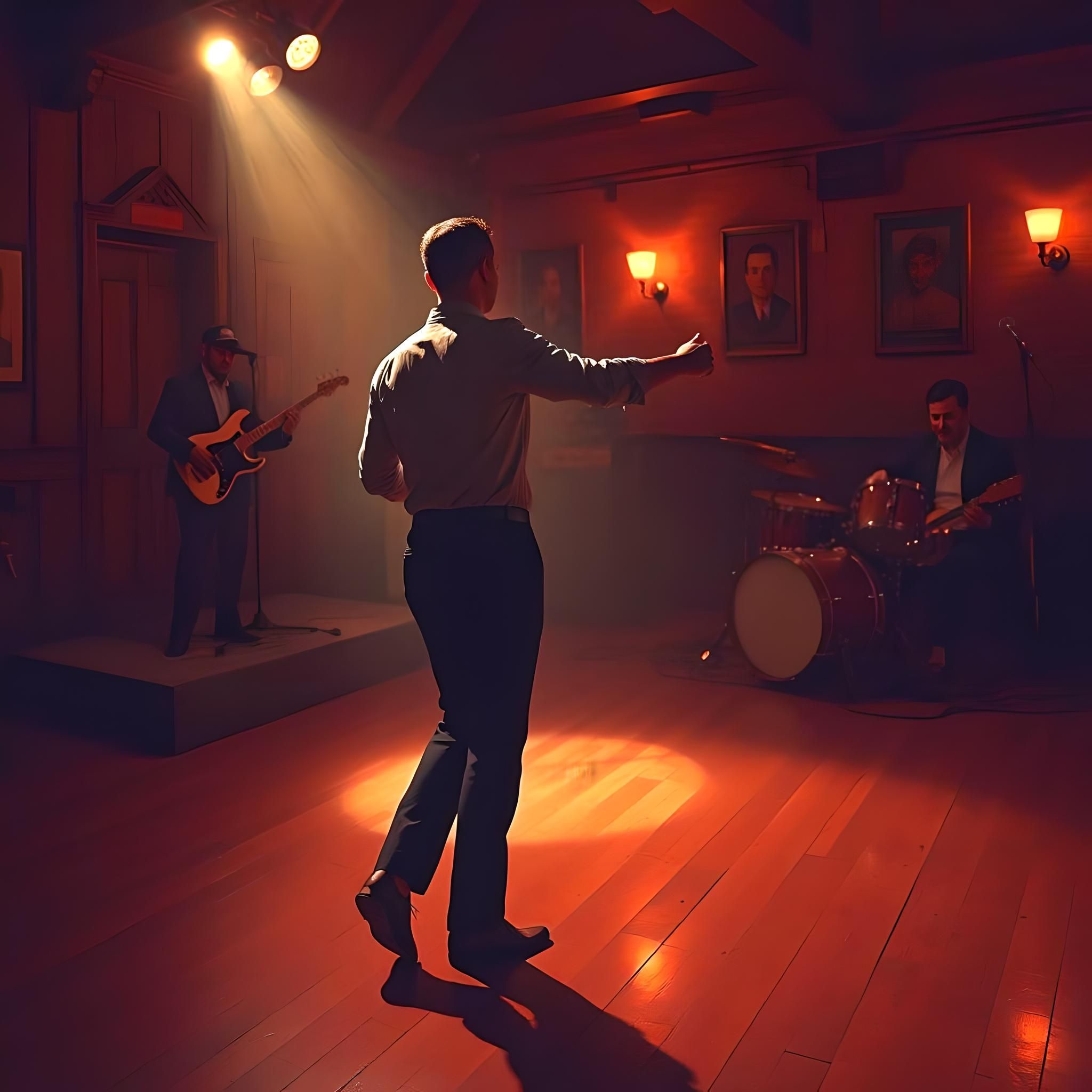 A noir-infused neo-prog space ballad blending brushed drums, phaser textures, and soft analog synth arps, Features moody Fender Rhodes, jazz guitar bends, upright bass, and a silky male lead vocal with a crackling undertow, Female whispers provide spectral harmonies on key phrases, The atmosphere is cosmic and sardonic, with layered soft brass swells and a subtle Moog lead adding nostalgic tension, The through-composed structure flows like a confession, deepening across each section with shifting harmonic beds and narrative instrumental cues, Tempo ranges 88–99 BPM in F# minor