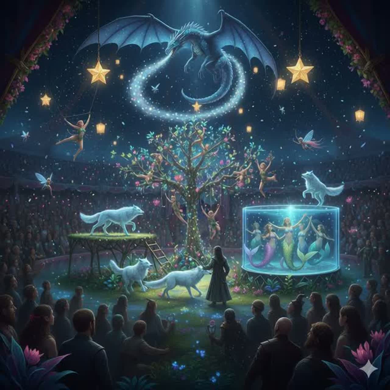 This fantasy folk electronic piece opens with ambient forest sounds, delicate harp plucks, and soft piano motifs, Ethereal female vocals float above a lush blend of light strings and airy flutes, Cinematic textures build with gentle percussion, subtle synth layers, and dreamy reverb at 90 BPM, crafting a magical, nostalgic atmosphere in a clean, detailed mix, ‑no heavy drums, ‑no trap or EDM drops, ‑no distorted guitars, ‑no loud bass, ‑no harsh vocals, ‑avoid aggressive tone
