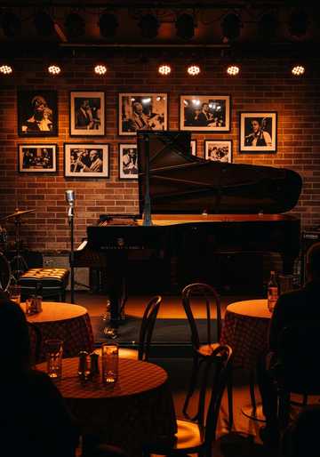 A concert at a chamber jazz club, the audience applauds and roars as the pianist masterfully plays a jazz theme that everyone in the room immediately recognizes, Later, the double bass enters, followed by the drums and brushes on the snare drum