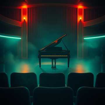 A concert in a chamber jazz club, the audience buzzing, the pianist masterfully playing a jazz theme that everyone in the room immediately recognizes, The stereo sound is exceptionally high, and every note of the concert grand piano is audible, The pianist changes rhythms from bossa to salsa, bebop, and swing