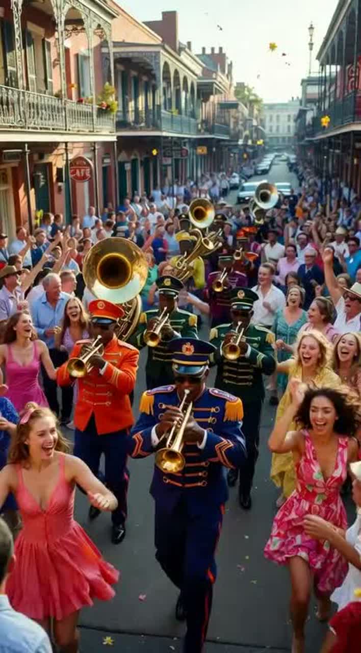 new orleans brass band jazz, tuba bassline, trumpets and trombones riffs, clarinet lead, street parade groove, bright major key harmony, joyful brass energy, vintage jazz festival atmosphere, structure: slow soulful brass intro → fast dancing second-line groove → lyrical warm trumpet melody, uplifting major mood