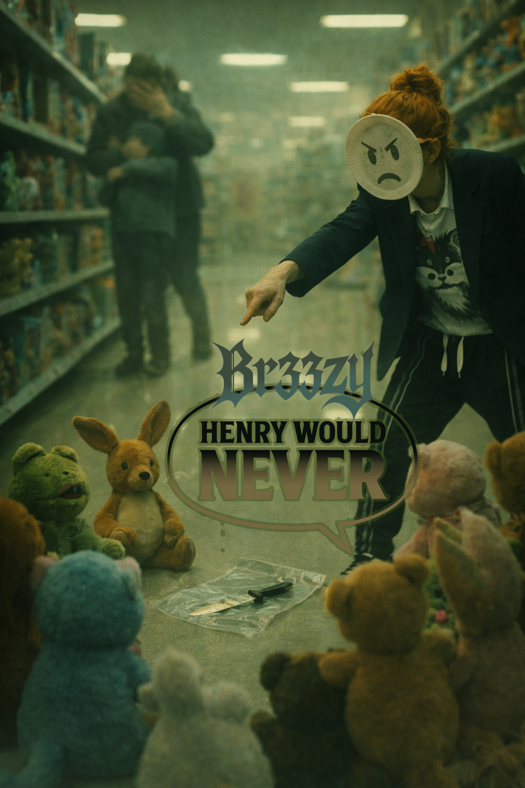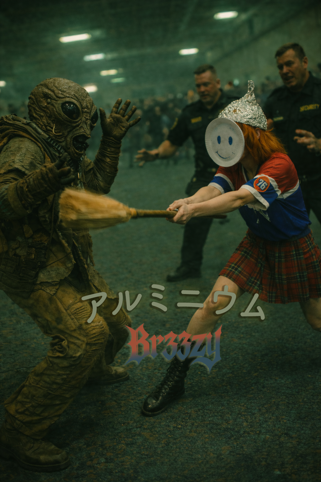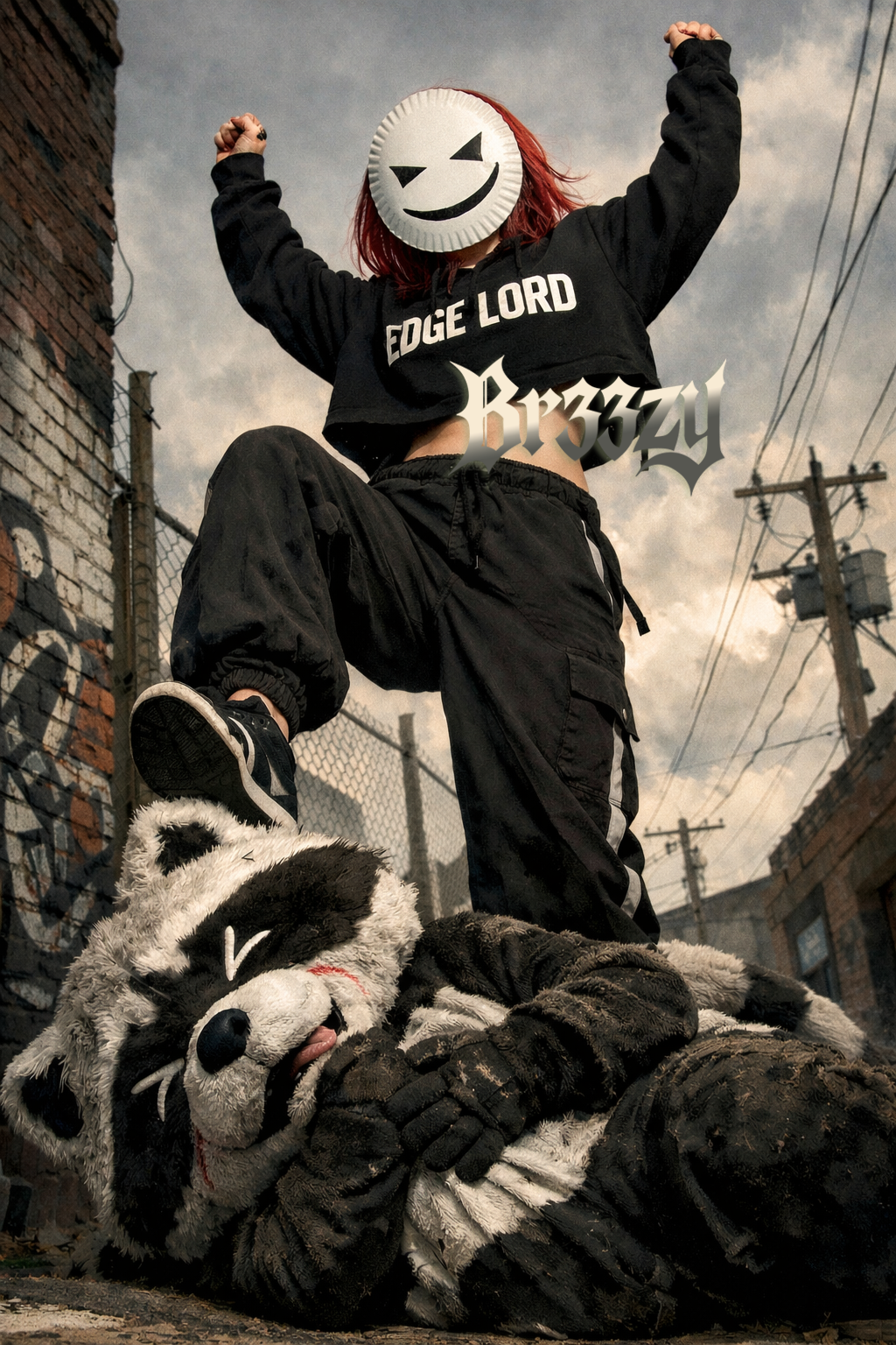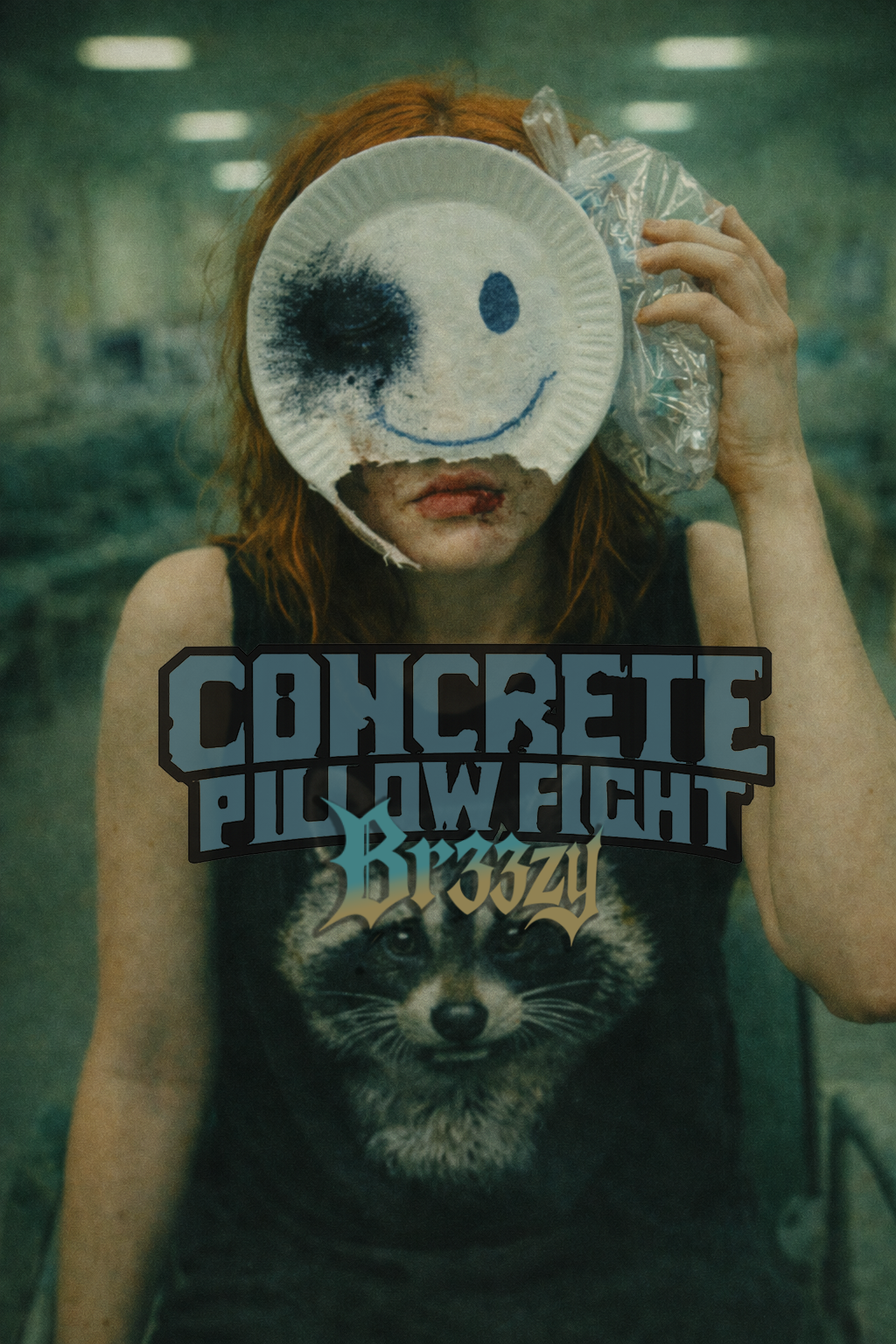 restrained heavy music in detuned A minor, This track is the album’s pivot into weight without release, Start with percussive slap acoustic guitar over a low rumbling current, Introduce seven-string guitar in drop A as rolling electricity, not payoff, No drops, no heroic riffs, no macho metal gestures, Heaviness comes from density, repetition, and pressure, Drums are dry and blunt with a deadened snare; bass is forward and grounding, Female alto vocal (Br33zy): intimate, feral, and unstable, Avoid dude-bro aggression, hardcore barking, or power belts, Vocal delivery shifts between soft purring, whispered chanting, strained melodic singing, and brief raw screeches, Breath, cracks, and pitch bends are part of the texture, Vocals sit inside the band, sometimes late or early, never dominant, Chorus denies release; chanting feels ritualistic and unsettling, not rallying, Overall tone is coiled and dangerous — a pillow fight filled with concrete