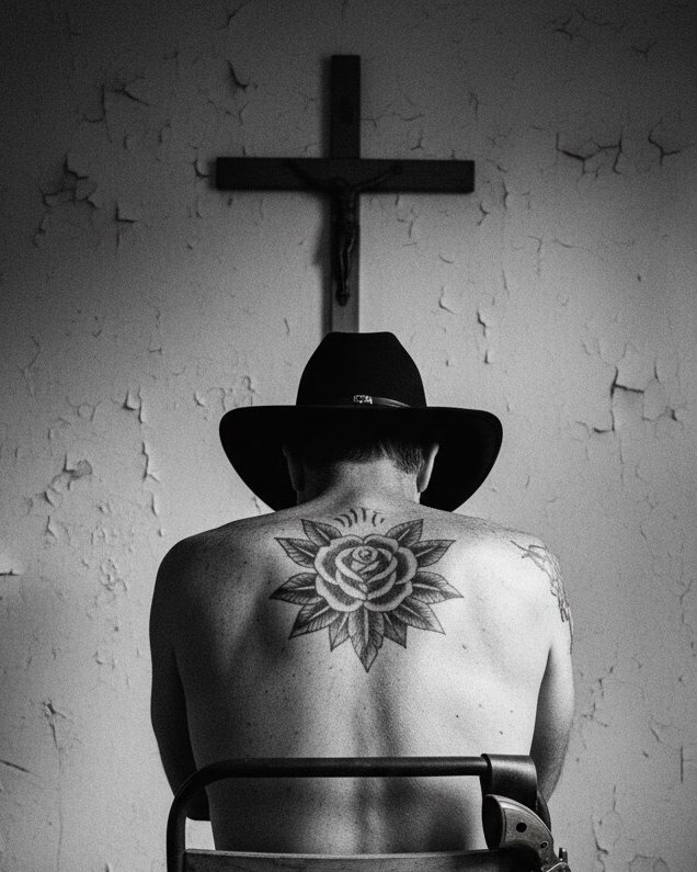 A dark country rock track with a driving rhythm section and a prominent electric guitar melody, The song is in a minor key, creating a somber and intense atmosphere, The tempo is moderate, around 120 BPM, The instrumentation includes a clean electric guitar playing a bluesy melody, a distorted electric guitar providing rhythmic chords, a bass guitar playing a walking bass line, and a drum kit with a strong backbeat, The male lead vocal is deep and gravelly, delivered with a narrative, almost spoken-word quality in the verses, transitioning to a more melodic and powerful delivery in the chorus, Production elements include a slight reverb on the vocals and guitars, giving a sense of space, and a balanced mix where all instruments are clearly audible, The song structure follows a typical verse-chorus format with an instrumental break and an outro