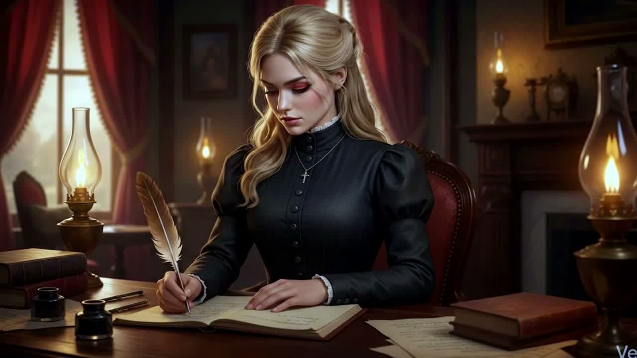 Visual Atmosphere: obsidian shards, storm-light nave, breath on glass, silver hands