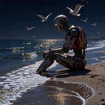 melancholic cinematic post-rock, slow brooding tempo 65-75 BPM, vast oceanic reverb, distant industrial drones and soft mechanical hums, lonely distorted electric guitar swells, ambient synth pads like rusting metal in the wind, introspective male spoken-sung vocals with slight robotic vocoder texture, bittersweet nostalgic mood, wide empty shoreline atmosphere, 2020s experimental indie electronica, Godspeed You! Black Emperor meets Max Richter meets Burial
