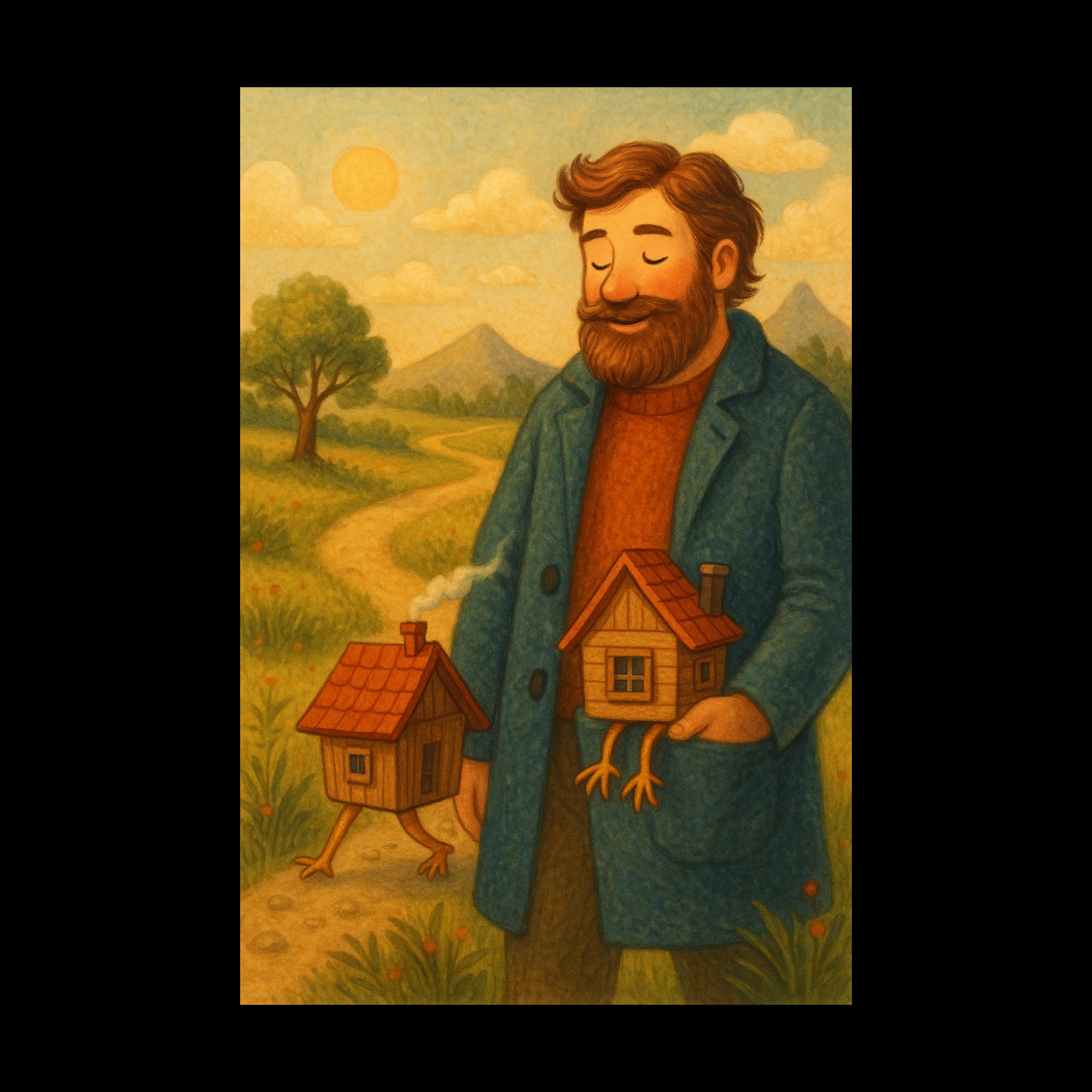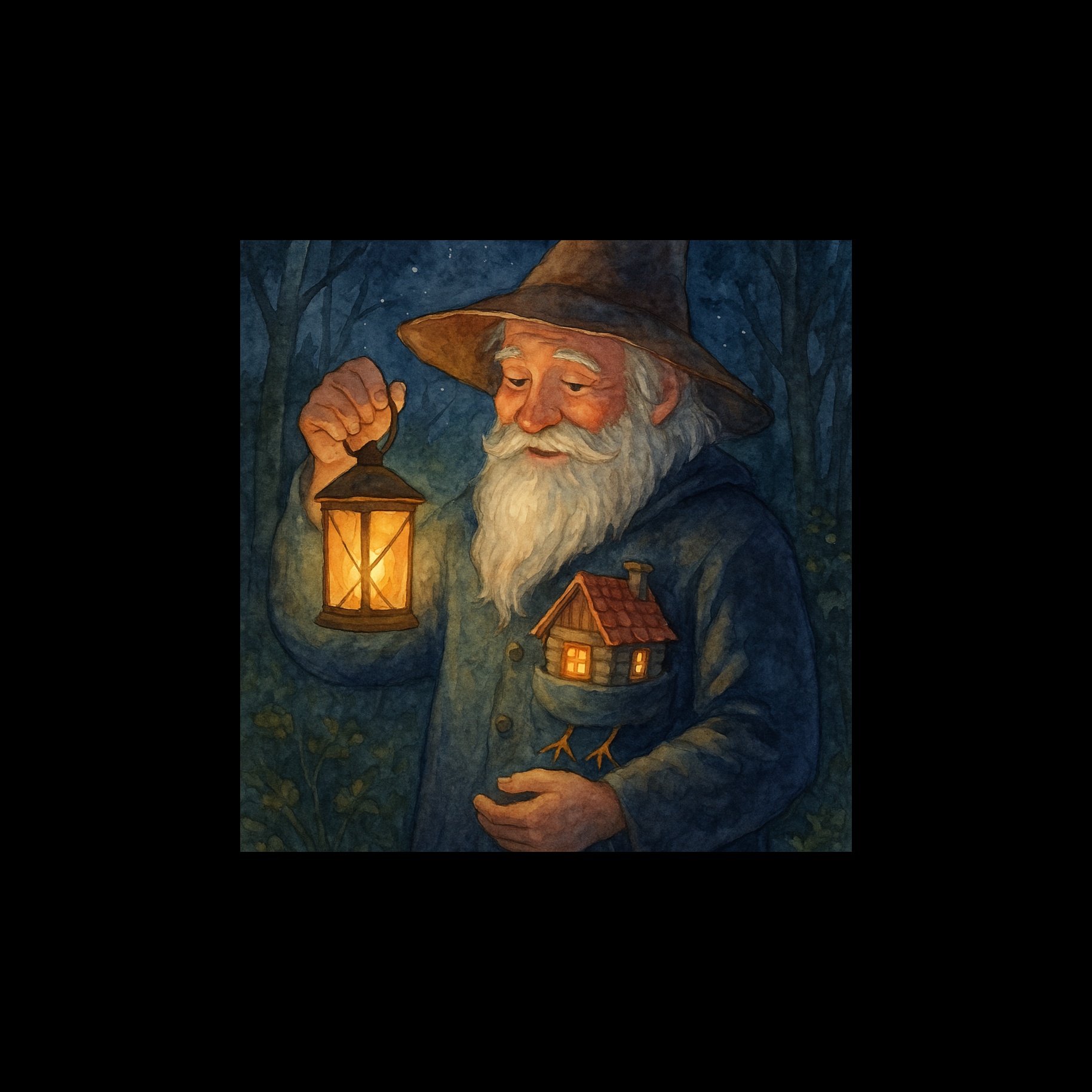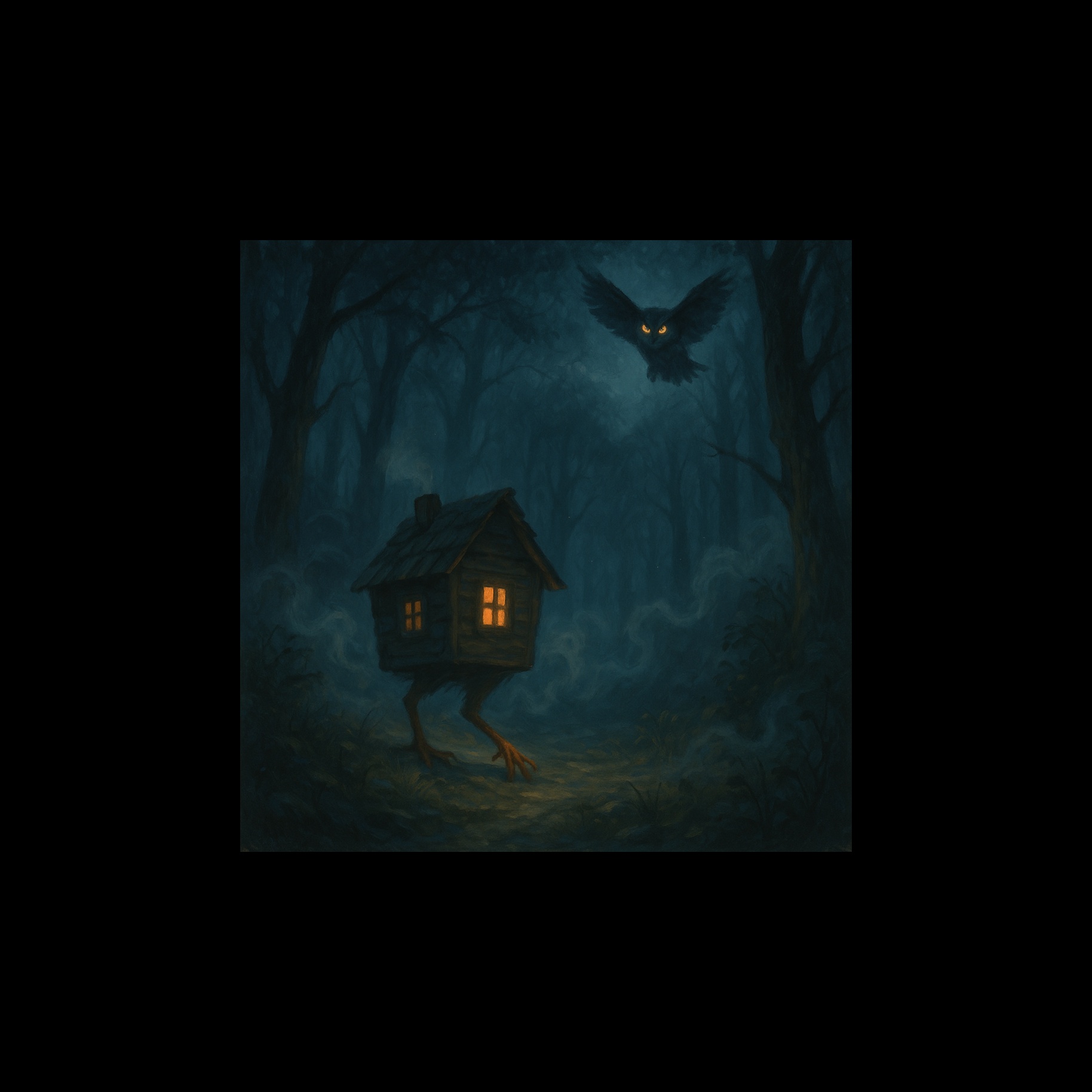 Mystic Synthwave with elements of jazz fusion, violin, bells, Darling, create in the very beginning an atmospheric magical atmosphere of a magical forest where a tiny hut on chicken legs is lost - wind whistling, owl cries, noise of trees, whispers, footsteps against the background of soft swaying of magical blues and Gregorian chants, Next introduce a gentle confused fiddle and bells-it's a little lost hut, The Good Wizard is built on jazz fusion, its theme is kind and confident, Finish with cheerful muffled children's laughter, as if the hut is fumbling inside the wizard's pocket and getting comfortable, Studio mastered