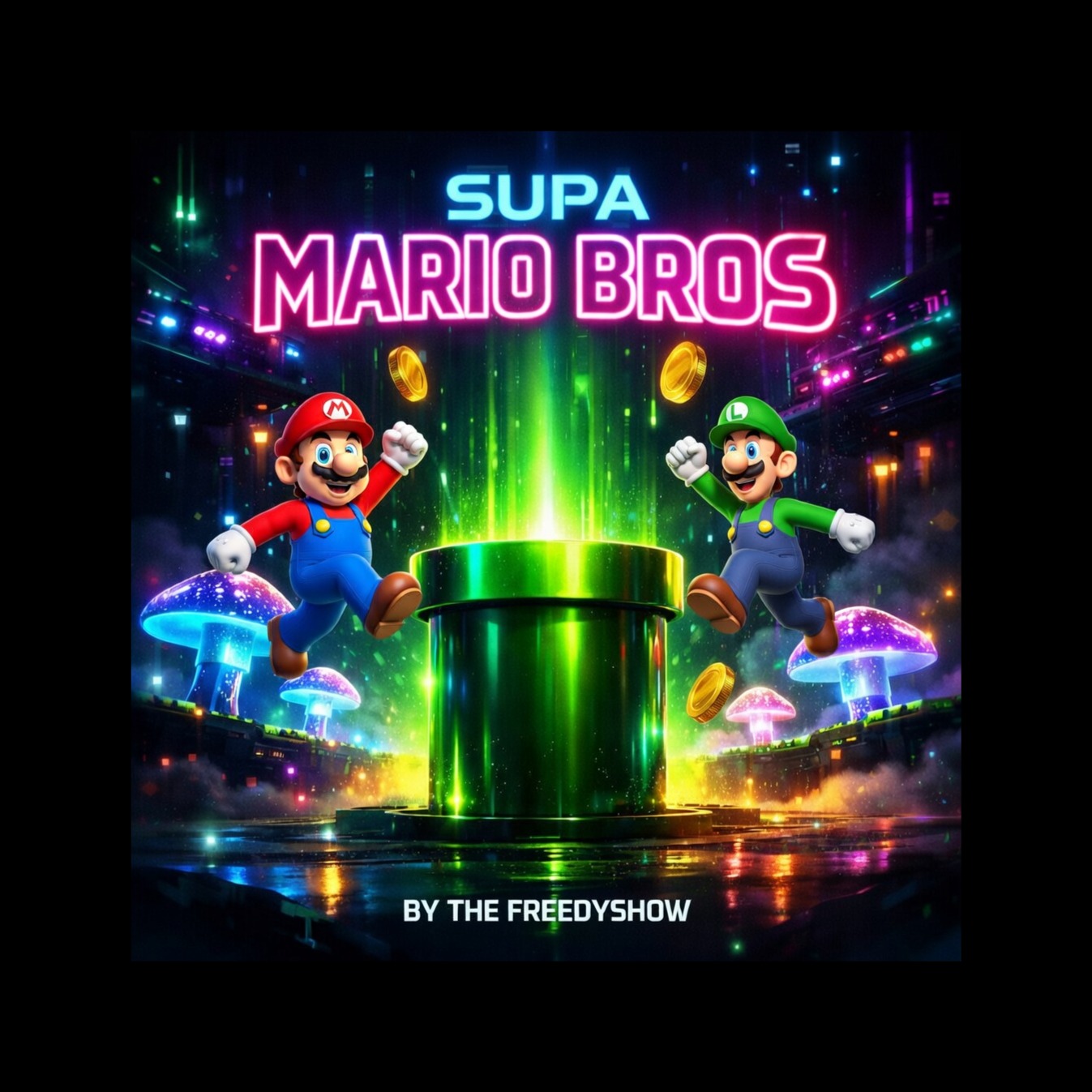 — Lead: powerful rap-rock vocal with a Mario-style accent and charismatic flair — energetic, slightly comedic but confident, rhythmic delivery matching drum breaks, — Second: deeper rap vocal with darker, aggressive tone for contrast and hype ad-libs, [Instrumentation] heavy glitch-guitar riffs, resonant sub-bass, metallic percussion, and eerie choir pads weaving between drops, [Production] glitch transitions, coin-sample fills, subtle pipe reverb tails, robotic stutters before each drop, [Mood] heroic, underground, chaotic yet triumphant — the brotherhood rising through neon tunnels to claim the crown; cinematic, dynamic, 4K energy fit for a legendary duo