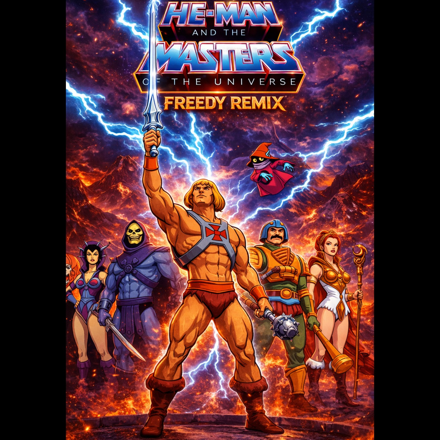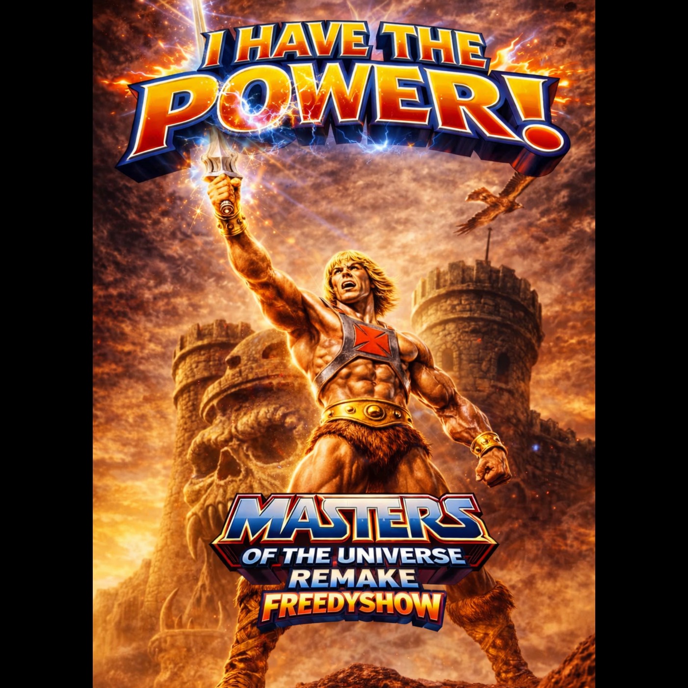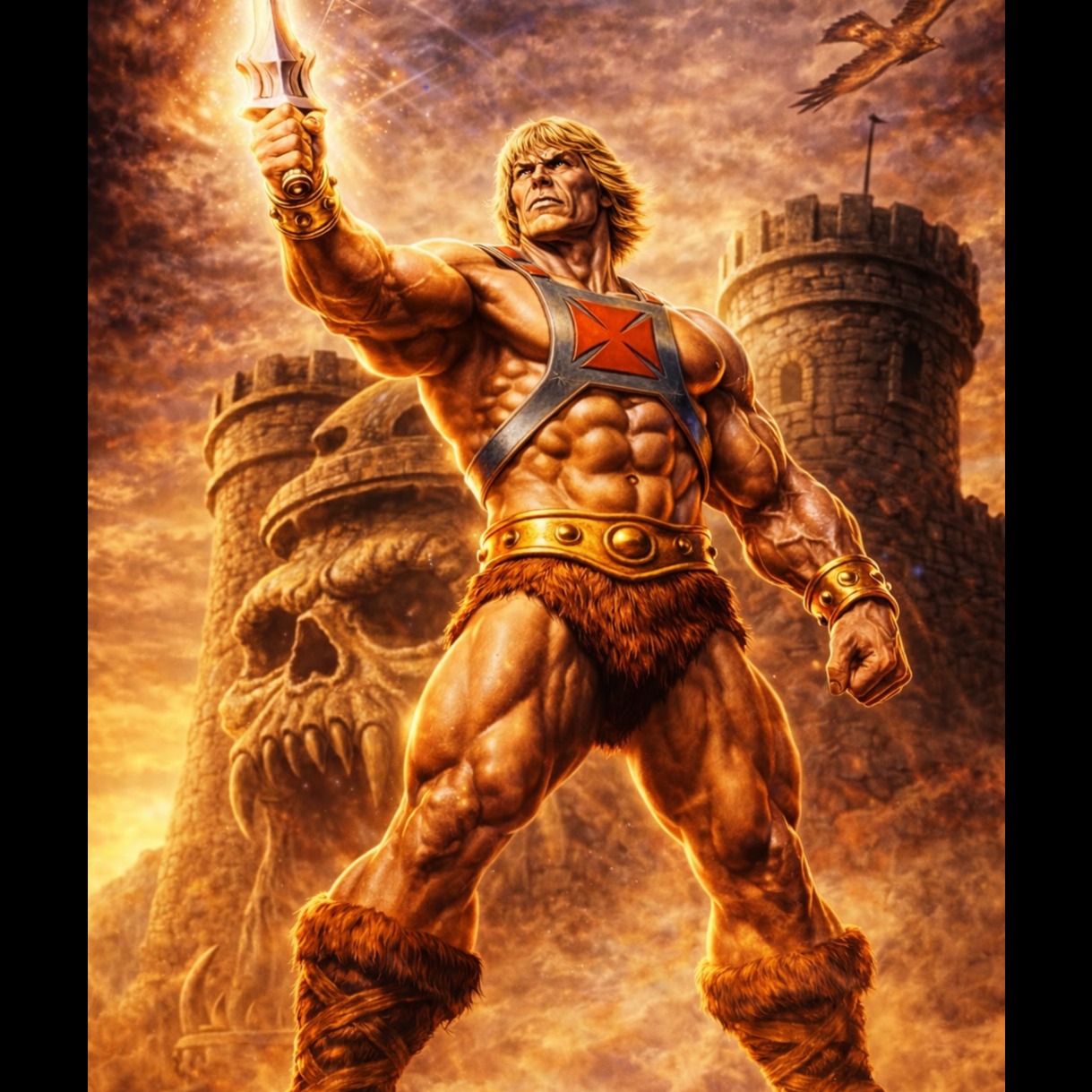 Cinematic heroic power anthem at 135 BPM in D minor, blending orchestral epic scoring with modern industrial rock and big beat energy, Inspired by the classic heroic tone of He-Man and the Masters of the Universe but reimagined for a modern cinematic audience, Massive war drums, thunderous percussion, hybrid orchestral layers (brass stabs, string ostinatos, choir chants) combined with distorted electric guitar riffs and deep sub-bass, Male lead vocal: powerful baritone/tenor with commanding delivery, gritty and emotional with strong belt (avoid high notes, focus on sustained power and control), Key moment: extended vocal belt on the phrase “HE-MAN” with rising intensity, vibrato, and slight grit, while instrumentation pulls back or sustains (pads, choir, low brass), followed by explosive drop, Include chant-style group vocals and call-and-response, Female backing vocals for ethereal reinforcement, ‑piano, ‑electric piano