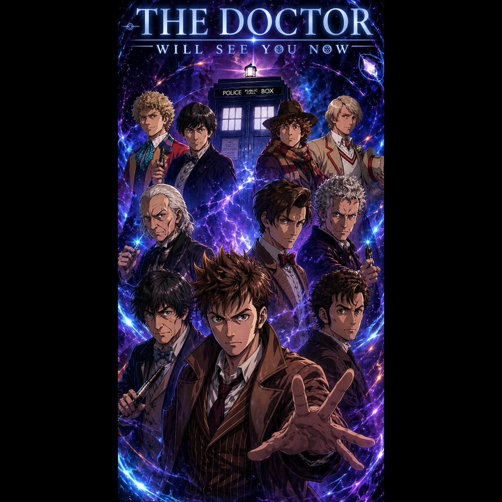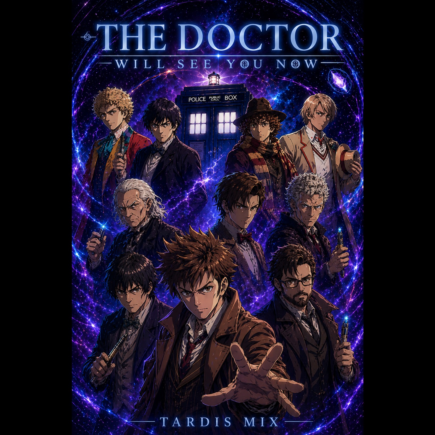 upbeat Doctor who inspired space Synthwave with a heavy emphasis on retro-futuristic soundscapes, The track features a prominent analog-style synthesizer playing a syncopated, staccato bassline and a lead synth with a bright, sawtooth waveform performing a melodic hook, A drum machine provides a steady beat with a gated reverb snare and a punchy kick, Shimmering synth pads and arpeggiated sequences add texture and movement, The tempo is 100 BPM in the key of D major 4/4 driving beat, The arrangement is characterized by its layered electronic textures and a driving, rhythmic pulse, Multiple vocals used in the bridge, Lead Baritone male The vocal performance transitions between a chest voice and a soaring falsetto during the melodic hooks, The production uses hall reverb on the singing vocals while keeping the spoken dialogue intimate and centred, with Female VOCALOID backing vocals with choir VOCALOID harmonies in time with the Snyth melodies