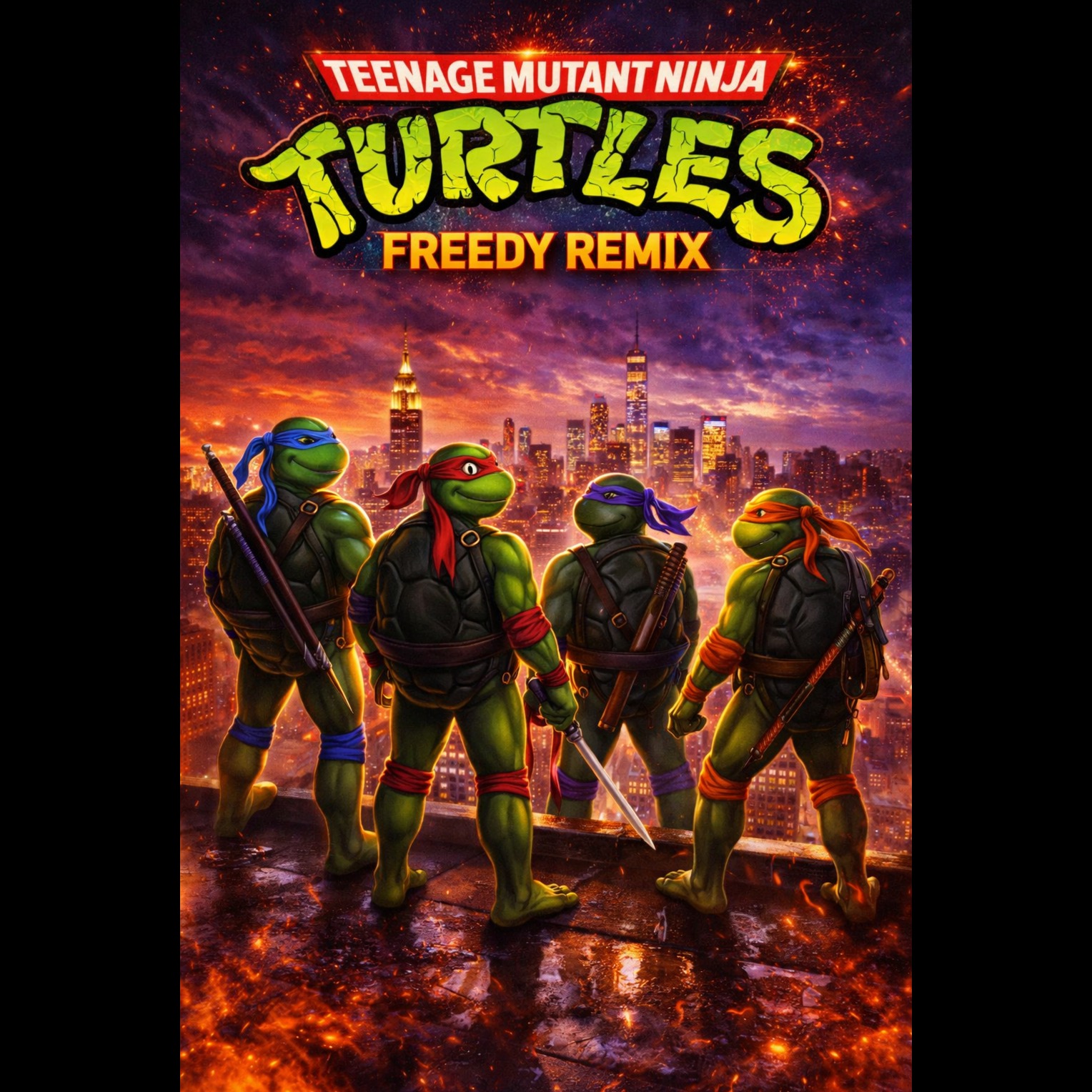 A high-energy industrial dance rock track at 135 BPM blending aggressive rap-rock vocals with big beat and electronic elements, featuring a powerful male lead delivering fast-paced, rhythmic rap verses with attitude and grit, combined with a strong female vocal used for hype lines, hooks, and melodic reinforcement, The track is driven by heavy breakbeat-style drums, punchy kick and snare, distorted basslines, and gritty synth textures, Verses are rhythm-focused with minimal instrumentation to highlight vocal flow, while the chorus explodes with layered vocals, chant-style hooks, and high-impact drops, Include call-and-response between male and female vocals, with the female voice reinforcing key phrases like “are you ready” and “Turtle Power", "Freedyshow" "Teenage mutant Ninja Turtles", Production is bold, energetic, and slightly chaotic with glitch effects, stop-start moments, and dynamic drops, maintaining a raw, rebellious, and anthemic tone throughout 5 minutes in length np piano, ‑Piano, ‑electric Piano