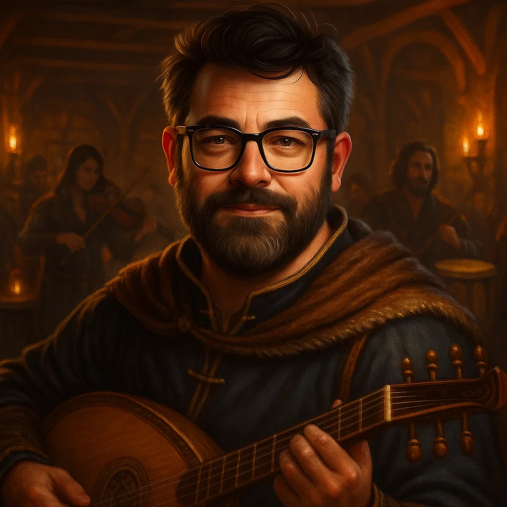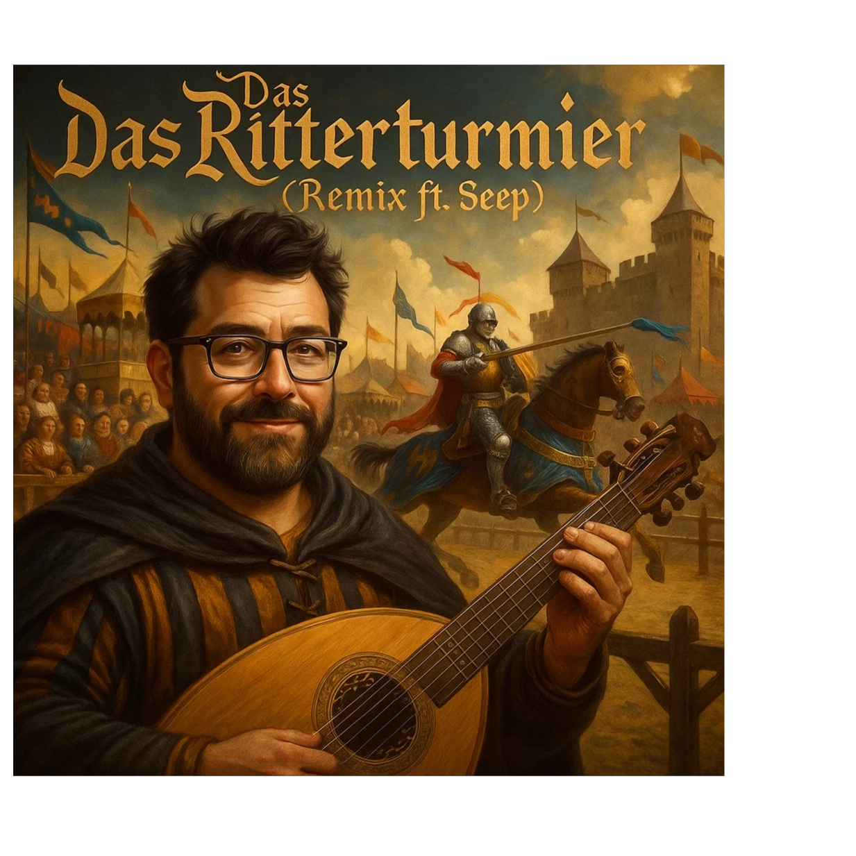 German medieval bard song, sung by a wandering minstrel at a tournament, Solo male vocal, warm and narrative, Acoustic lute, hurdy-gurdy, and hand drums, Cheerful but dramatic storytelling tone, Tavern and festival atmosphere
