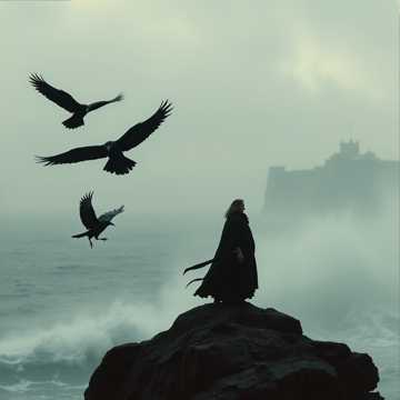 Nordic cinematic storytelling with deep male vocals, ancient Norse saga style, atmospheric and dramatic orchestration, Focus on Norse mythology: Fenrir, Odin, Thor, Loki, Freyja, Hel, Ragnarök, Huginn & Muninn, Includes Old Norse chant: "Vǫlvan mælti, " as spoken intro or chorus, Slow tempo, war drums, tagelharpa, runic ambience