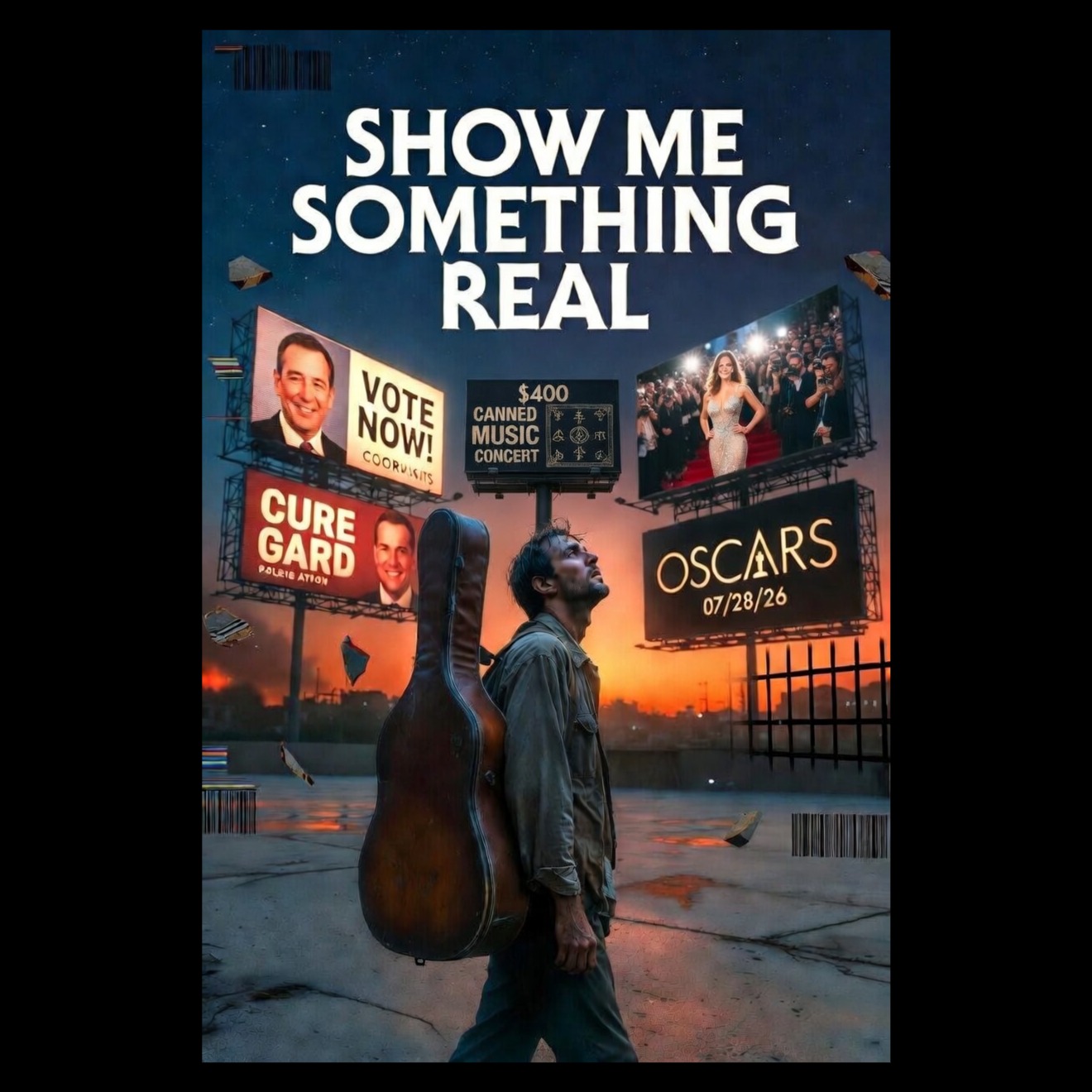 Dark indie folk meets trap 808 hybrid, haunting acoustic guitars and banjo textures over deep rumbling 808 kicks, warm tape saturation, subtle glitchy electronic pads, sparse cinematic production, raw weathered male vocalist with natural conversational drift delivery, emotional resonant hooklines, deliberate structural breaks using drift-hookline-signal method, longer wandering verses that feel disillusioned, anti-establishment rage against big government big pharma big tech hollywood and commercial music, desperate search for authenticity, mid-tempo with heavy low-end drops in signal section, intentional messy structure, treat Drift 3 with looser more spoken delivery and different rhyme feel than the other drifts, emphasize "show me" in first line, keep all pre-hooklines identical including "INTENTIONALLY", no polished pop elements, raw human frustration, 88-92 BPM, minor key