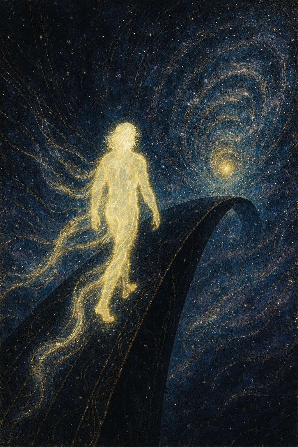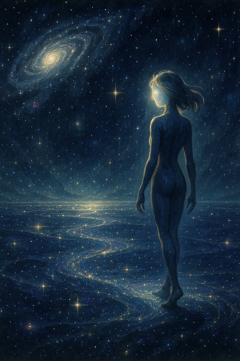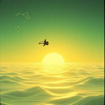 Intro (00:00–00:20): solo slack-key guitar, Verse (00:20–01:00): add ambient pad and light percussion, Chorus (01:00–01:30): trumpet echoes guitar motif, Bridge (01:30–02:00): full trumpet solo over guitar glissando, Outro (02:00–end): guitar returns solo, fading into ocean sound, Tempo: 70 BPM, 4/4 time, No vocals, purely instrumental, Style note: Tell the story of a cosmic traveler wandering between waves and stars