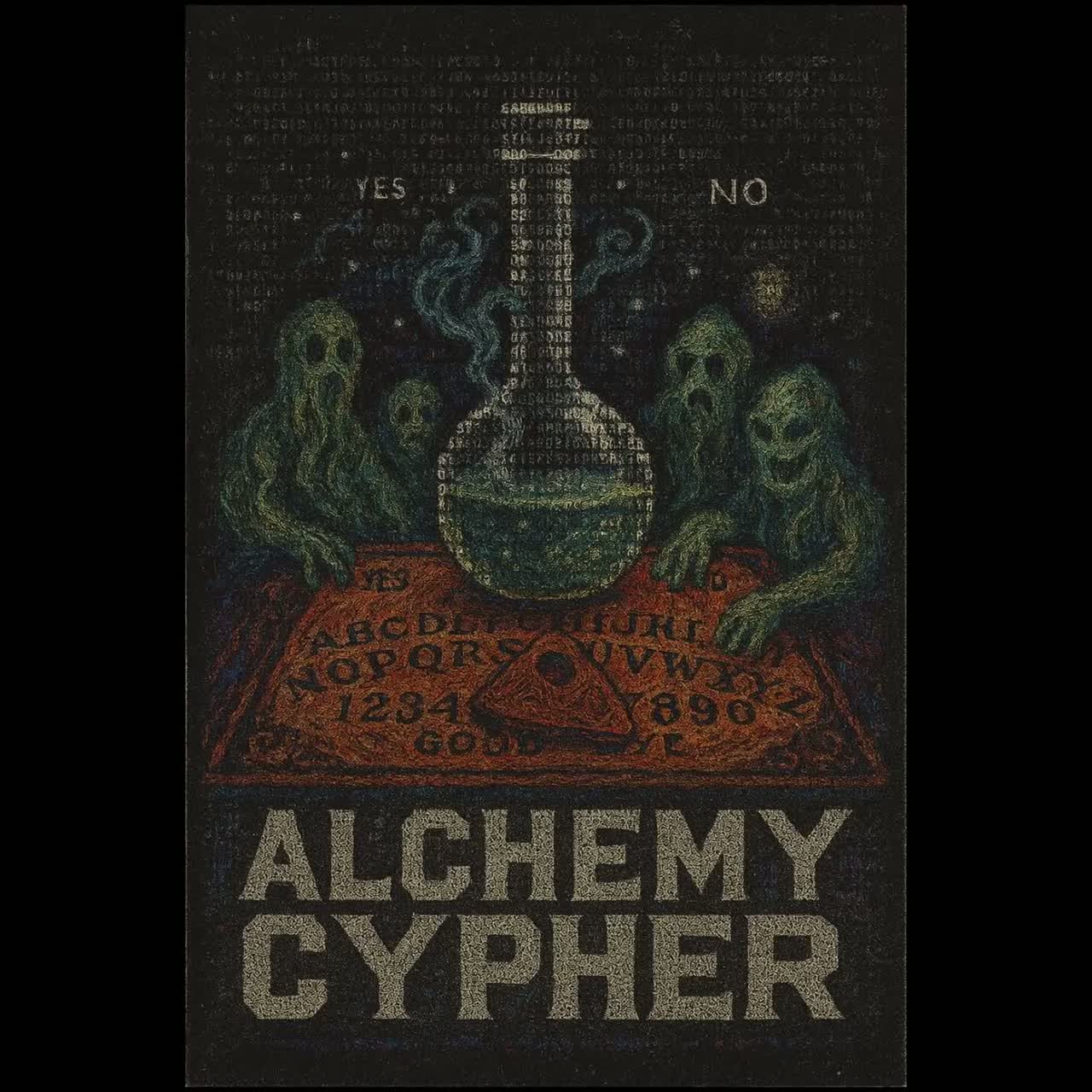 Underground Hip-Hop, Rap, Cypher, Boom Bap, ultra-deep Dolby sub-bass with harmonic layering and stereo widening, dual haunting alien soundscapes with spatial separation and panoramic placement, extended reverb tails and shimmer delays for cosmic atmosphere, muffled trap kick tucked beneath the mix with sidechain to bass, sharp transient crisp snare on hypnotic rhythmic loop, layered drum pad samples with micro-precision sequencing