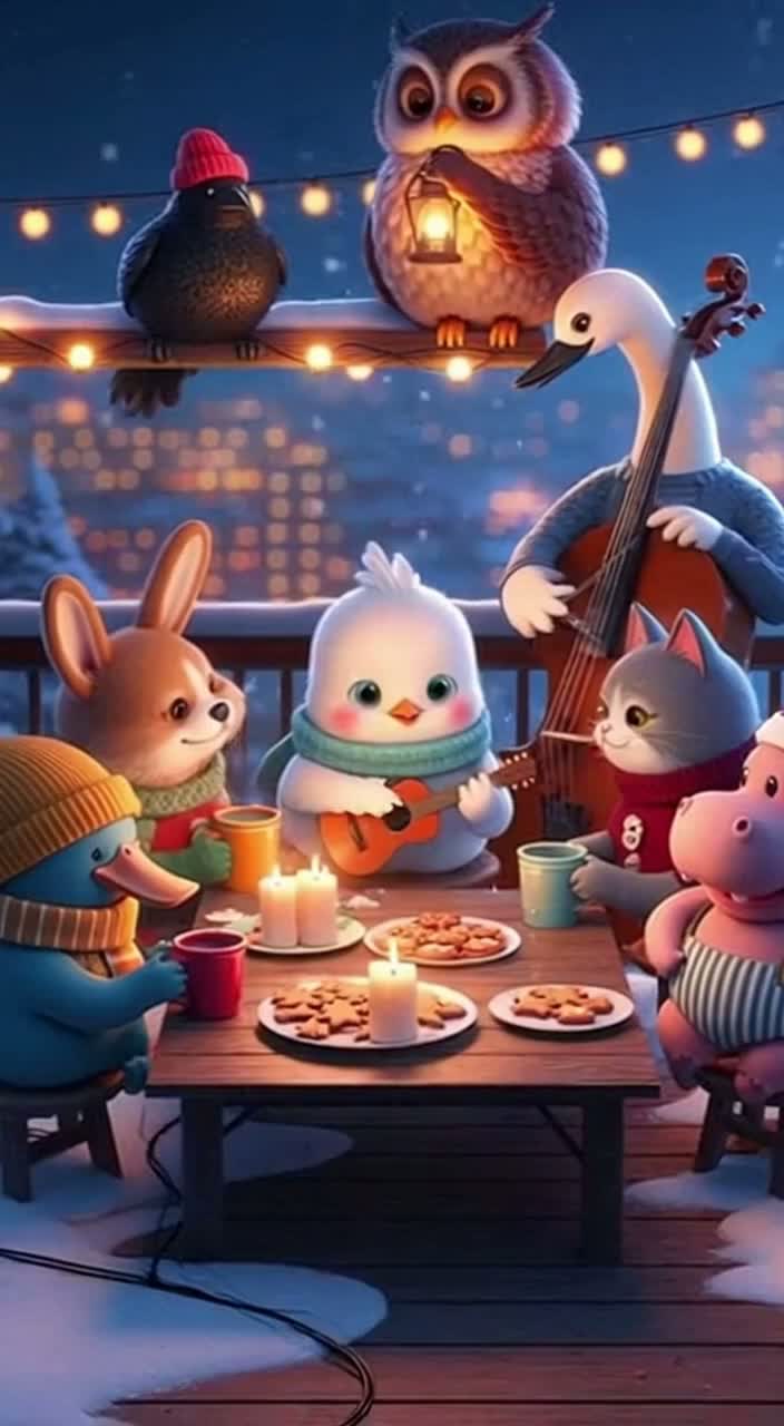 heartfelt, gentle bass pads, folk, warm tape delay, musical, vinyl crackle; intimate “around-the-living-room” feel with group singalong chorus, mixed-gender stacked vocals on hook, overall cozy and understated but radio-ready, dusty drums, lo-fi winter holiday track, subtle sleigh-bell textures, nylon-string guitar and soft electric piano
