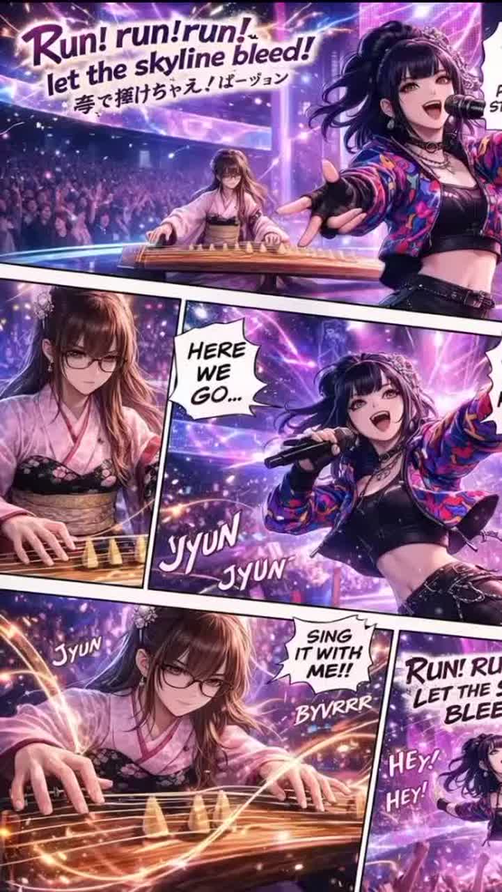 Emotional Club × Okinawan Eisa Fusion featuring Twin Female Vocalists, A cinematic blend of modern EDM, melodic trap, and traditional festival rhythms, Minor-key progressions meet paranku percussion in a 150–155 BPM emotional framework, Vocalist 1 (Melodic Lead): Soprano–mezzo range, Uses breathy head voice, glide phrasing, legato, and soft vibrato, Choruses and hooks emphasize long reverb tails, ambient layering, and emotional swells, Vocalist 2 (Rap/Rhythmic): High-speed triplet rap and syncopated flows, Alternates between chesty drive and whispered falsetto, Spoken-word insertions and rhythmic punchlines shape the verses, Sound Design: Four-on-the-floor kicks with Eisa-inspired snares, Deep analog 808 bass with glide automation, Shamisen plucks, reversed FX, chorus pads, Sidechain compression across rhythm layers, Ocean ambient textures and festival echoes fill space, Reverbs emulate open air and memory