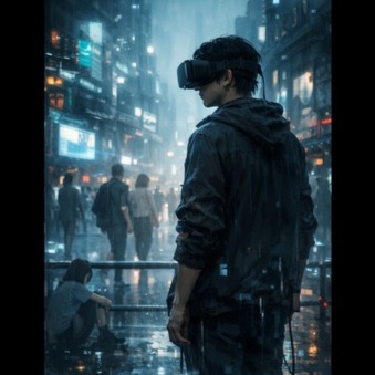 Emotional alternative J-pop with cinematic atmosphere, BPM 80, piano and ambient synth pads, subtle electronic textures, minimal beat, melancholic and introspective mood, male vocal, slow build chorus, slightly futuristic sound design