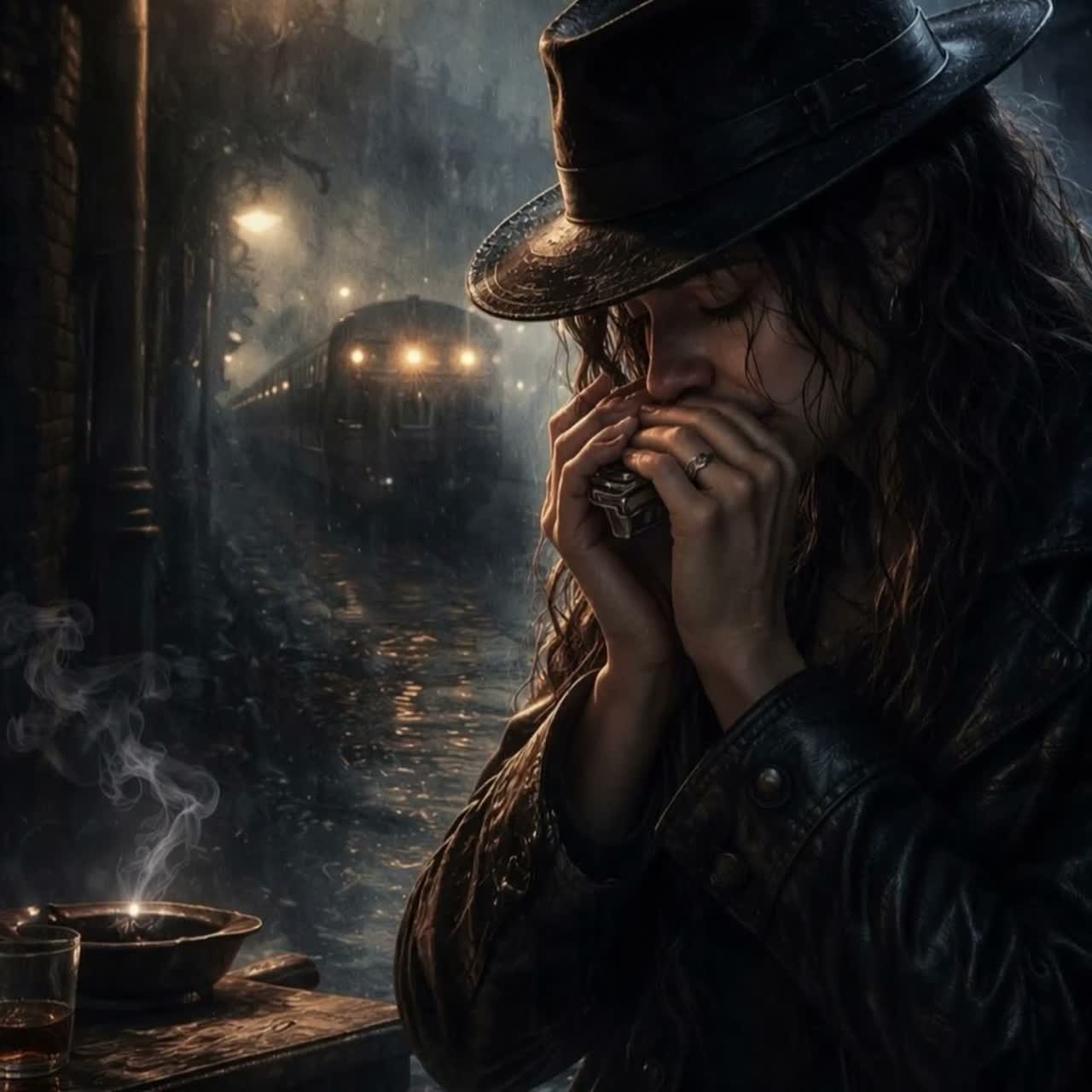 Dark Chicago Blues, Slow Blues, BPM85, Harmonica Lead, Minor Key, Deep Bending Notes, Moody Female Vocal, Heavy Space, Minimal Arrangement, Train-like Harmonica, Painful and Gritty Atmosphere