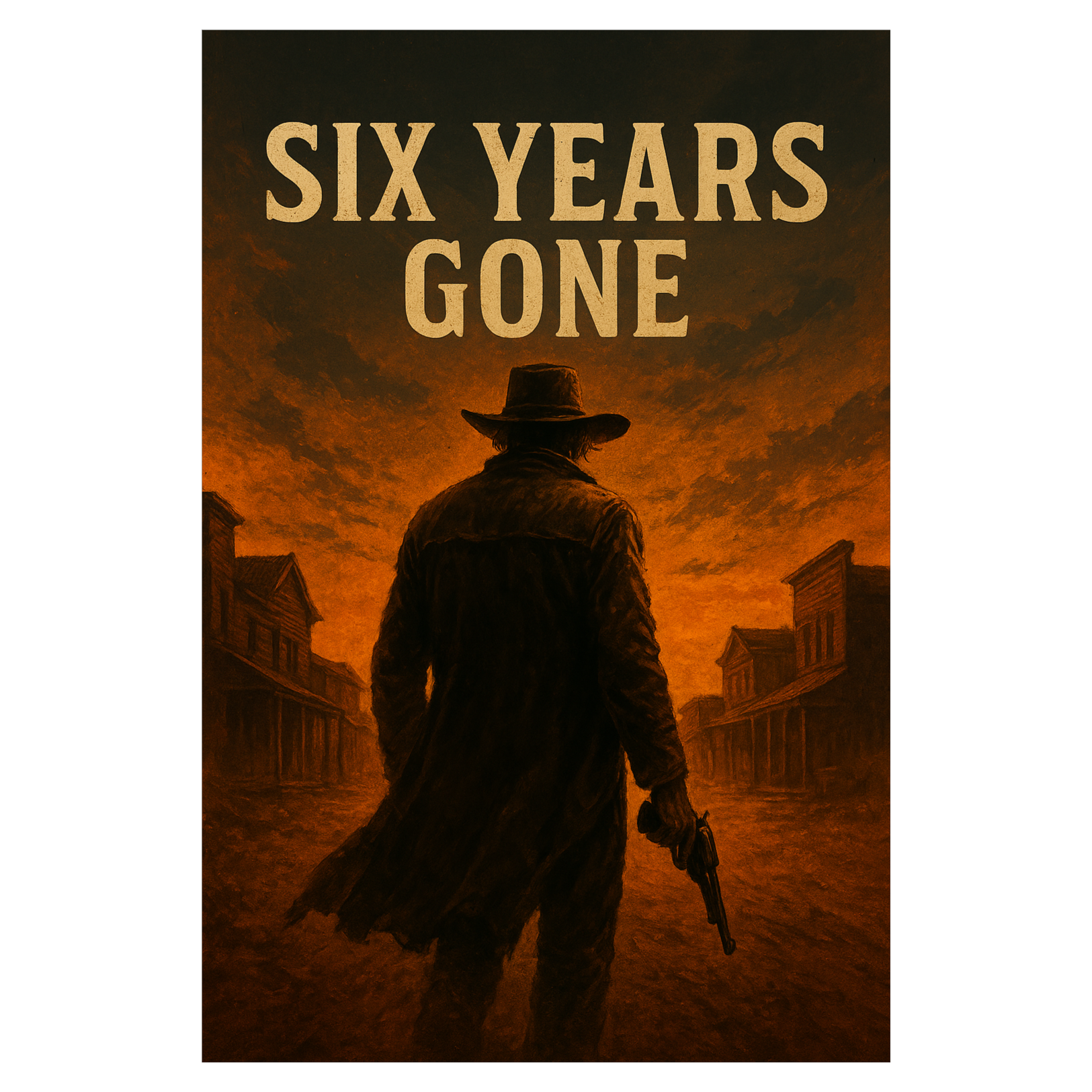 fast cinematic Italo Western revenge ballad with gritty, emotional, desperatet and shouting male vocals, with twangy guitar, sad harmonica, powerful drums, and sweeping strings, The lyrics tell the story of a man returning to a ghost town after six years to avenge the murder of a loved one, Dark, haunting, poetic, with a sense of slow-burning anger and inevitable justice, Ends in a somber, powerful tone