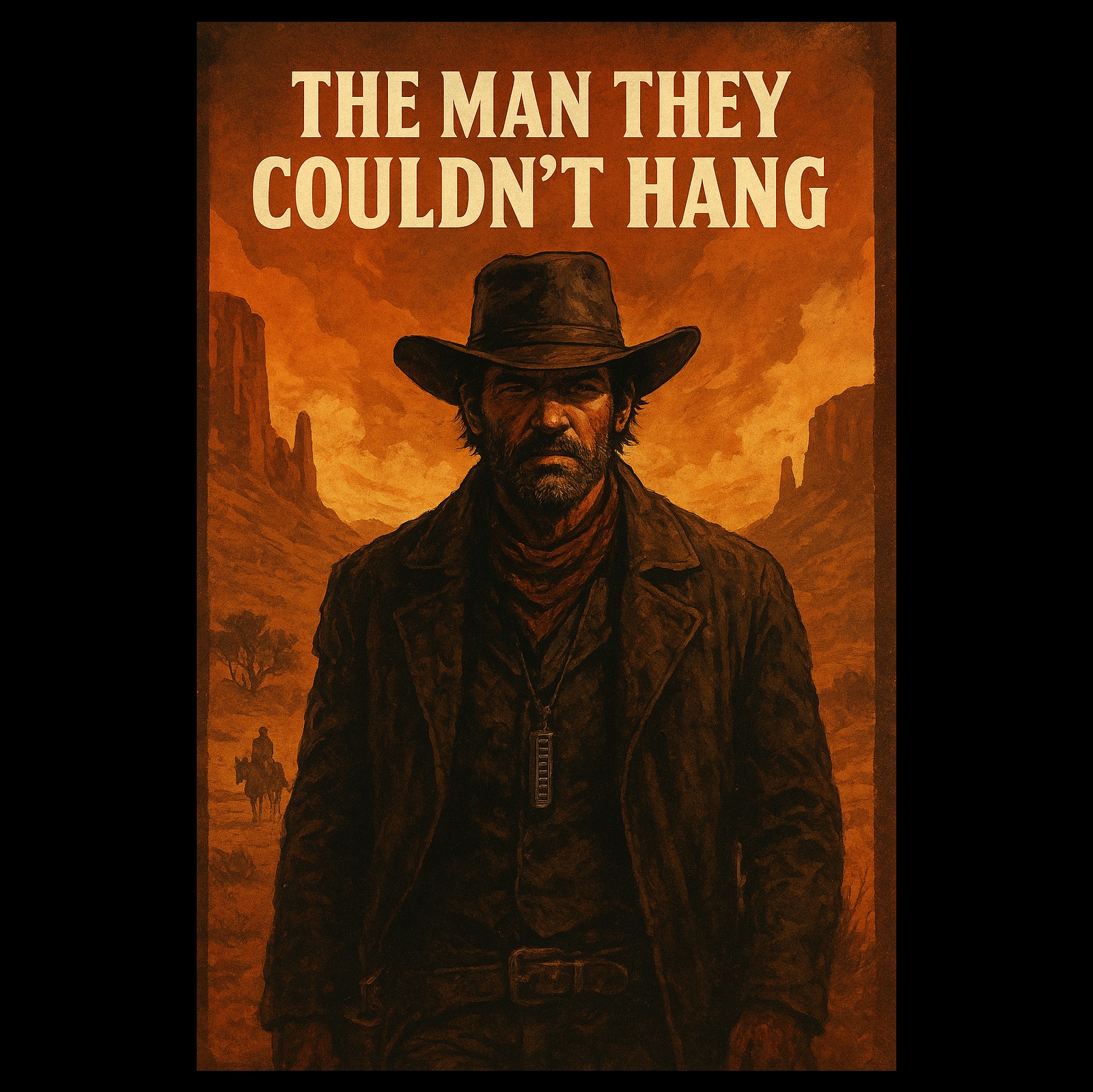 a cinematic Italo Western ballad with deep, gritty, emotional and sometimes angry, rough male vocals, Featuring steel guitar, emotional, melodic harmonica, dramatic strings, drums, and a man choir sings the Chorus, female background singers, The lyrics tell the legend of a mysterious gunslinger known as “The Man They Couldn't Hang” – a feared, mythical figure who cannot be caught, killed or forgotten, Moody, epic, ghostly Western atmosphere, with long instrumental parts and strong emotional storytelling, ‑electric guitar