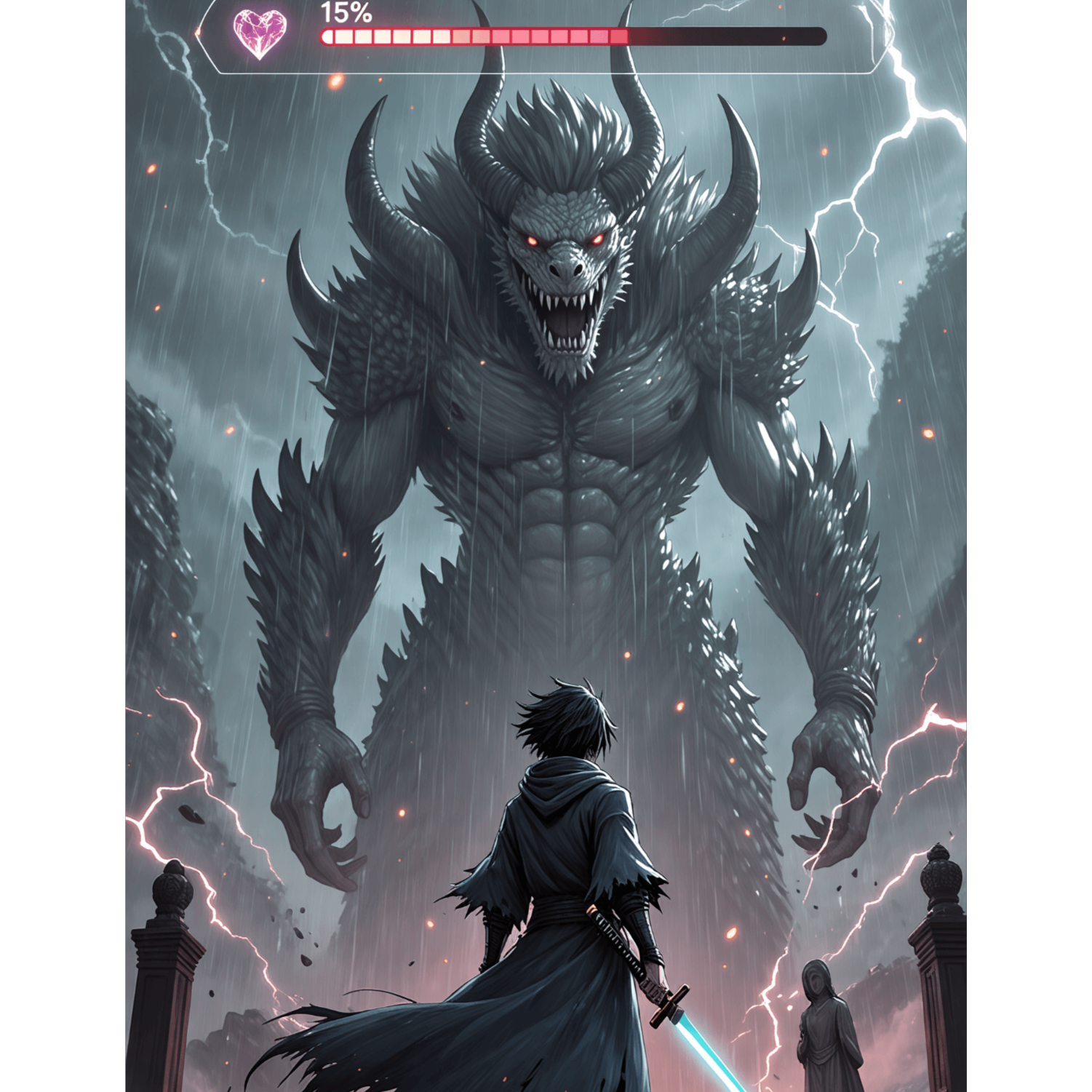 Anime final boss OST hybrid at 180 BPM (double-time), Styles: melodic dubstep × drum & bass × symphonic metal × taiko/cinematic percussion with cyberpunk synths, Electric guitars: tight palm-mute riffs, octave power chords, soaring harmonized lead for the main motif, DnB drums with rolling breaks and a cutting snare; switch to half-time for dubstep drops with clean sub, punchy growls and laser stabs, Taiko ensemble and clacks drive a war cadence; occasional psy-style triplet fills and risers for chaos, Emotional minor-key theme carried by lead guitar and strings, answered by a bright lead synth, Structure: cinematic intro (taiko), dramatic build, Drop A (DNB + guitars), lyrical breakdown (piano/strings, melodic dubstep theme), Drop B “final form” (half-time dubstep + double-kick guitars + taiko swells) → victorious coda, Sound design: sword-clash hits, reverse whooshes, short kiai shouts, Mix: wide, heroic, loud yet dynamic; sub clean, guitars crisp, sidechain pads to kick