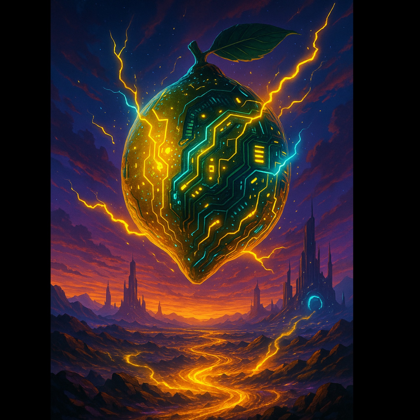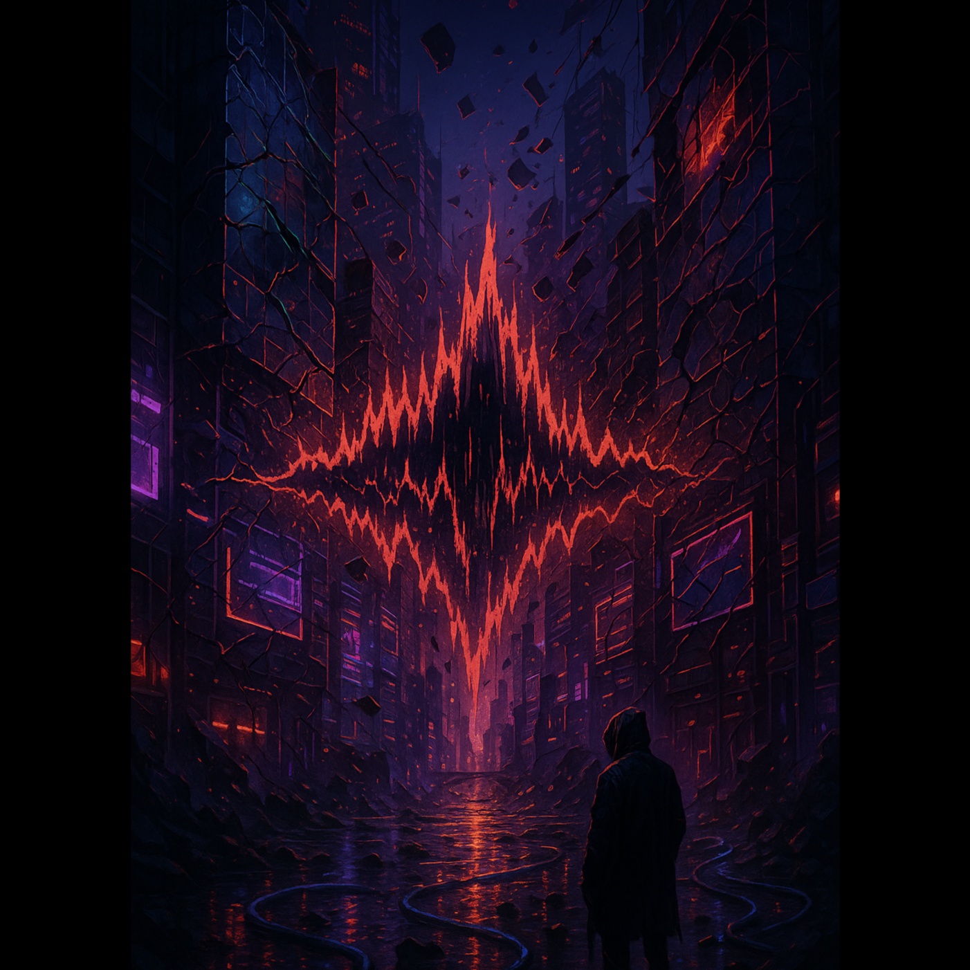 Dark techno / hardtek track with powerful, heavy basslines, sharp industrial-style percussions, Includes wild melodic flights with evolving arpeggios, dramatic synth risers, and chaotic lead modulations, High-intensity energy, dark atmosphere, glitchy breaks, and psychedelic tension, Heavy sidechain, dynamic drops, Inspired by underground raves, dystopian sci-fi, and cyberpunk chaos, Keep a punchy groove with syncopated hats and rhythmic vocal chops