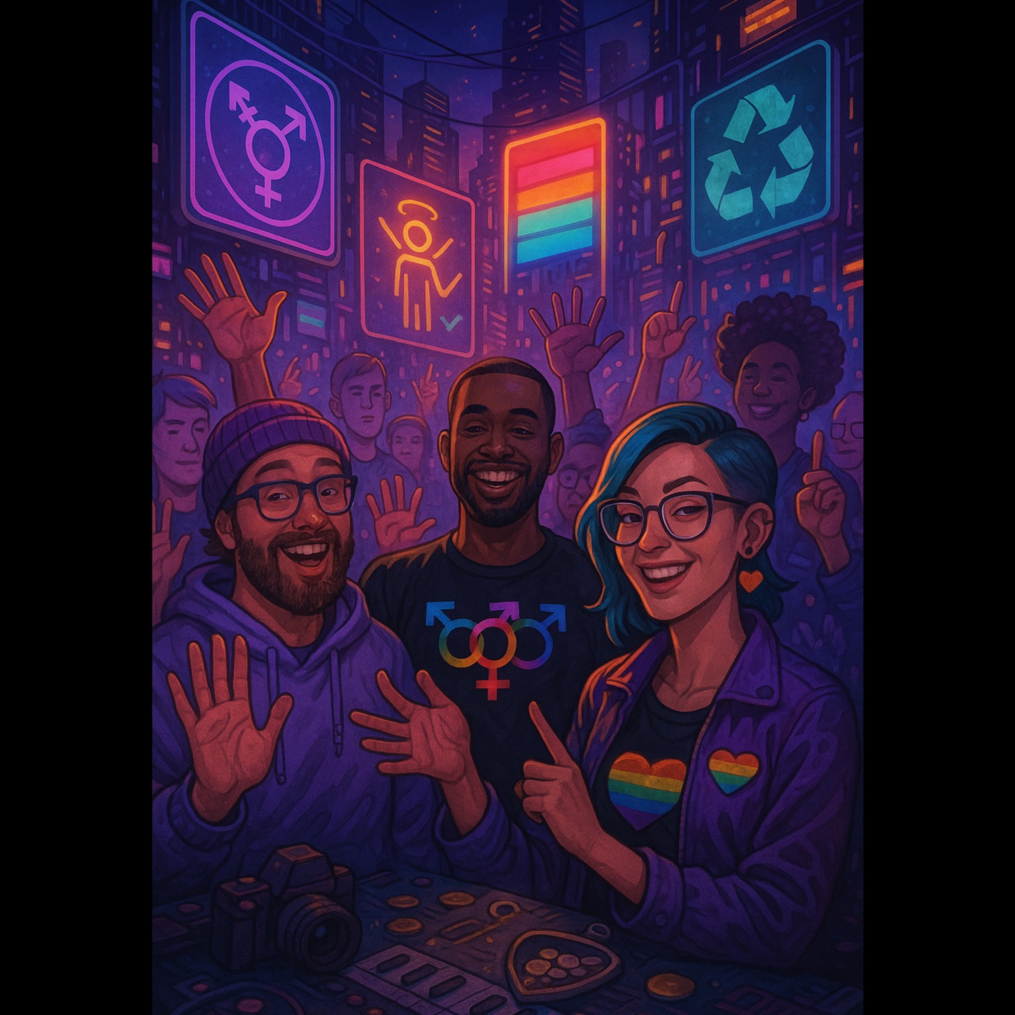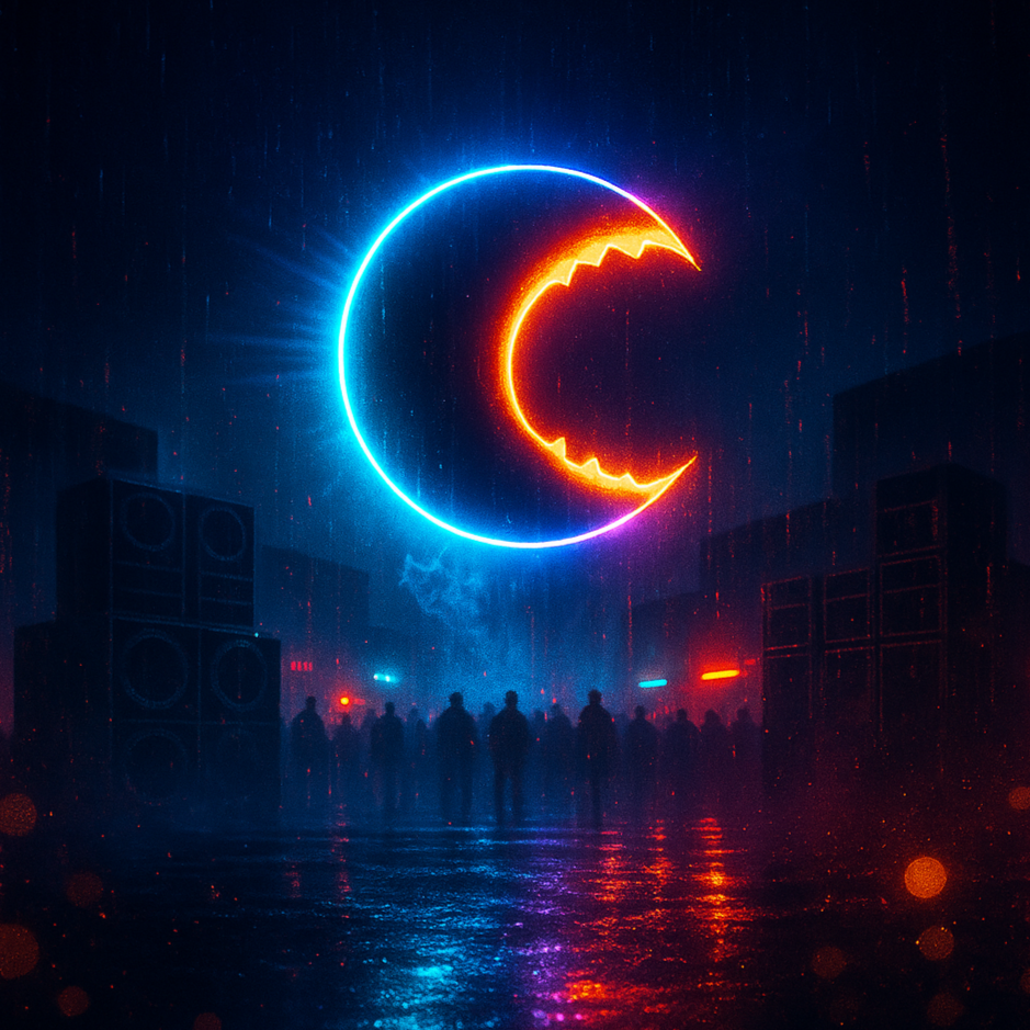 Hardtek x Acid Techno x glitchcore x Satirical Cyber-Energy, 150 BPM, aggressive distorted bass, dark hypnotic acid leads, glitchy transitions, intense drops with pitch automation, robotic and vocoded FX, industrial percussion, crowd-ready, cynical tone with high-intensity rhythm