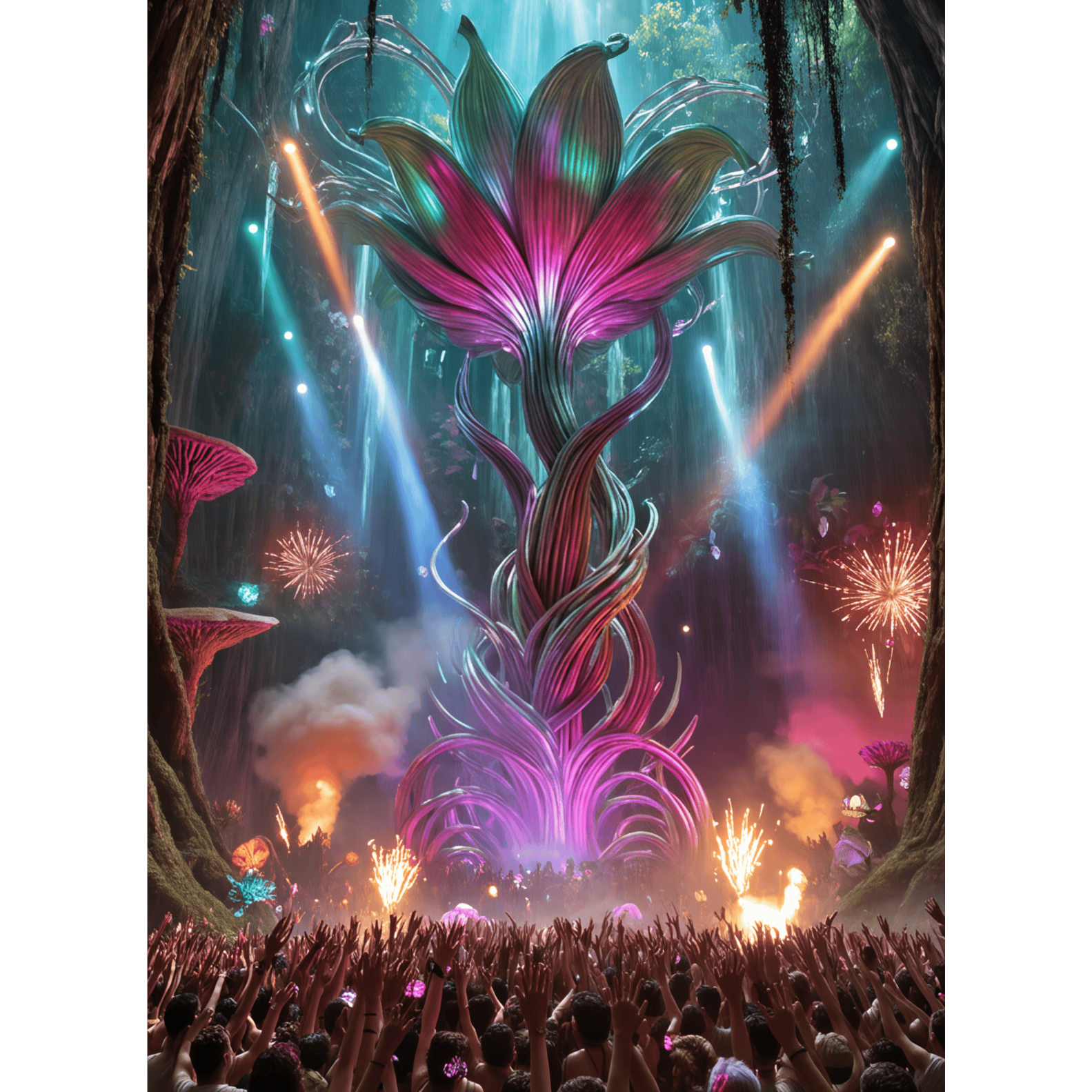 Epic forest trance fusion with psybient and cinematic elements, uplifting melodic trance build-ups, deep rolling basslines, hypnotic arpeggiated synths, tribal percussions, lush ambient textures, organic instrumentation (like flutes and soft strings), dynamic tempo changes, emotional progression, mystical atmosphere, festival vibe, perfect for a magical night rave in an enchanted jungle, high energy and immersive sound design