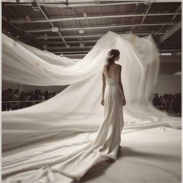 Fashion show, blurred movement of a model in her 20s, dressed in a white and gold fantastic outfit