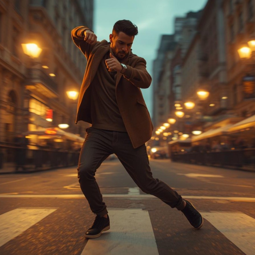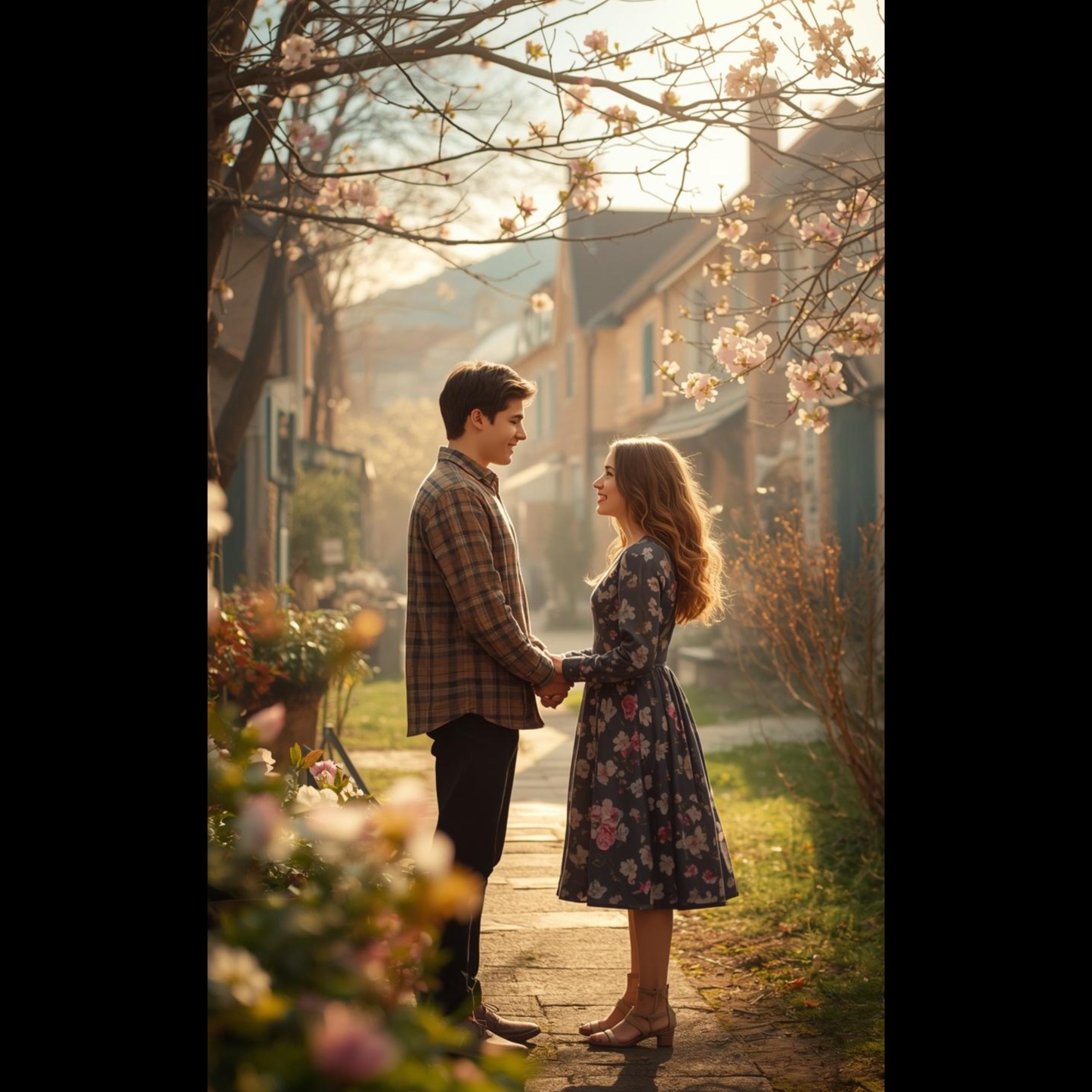 Smooth, intimate R&B with gentle melancholy, Features warm Rhodes piano chords, soft synth pads, clean electric guitar with subtle reverb, light brushed drums, delicate vinyl textures, faint distant traffic hum, quiet street ambience, soft bell tones for evening depth, Keep mix spacious, breathing, with natural reverb like quiet neighborhood at dusk, Tempo 80-85 BPM for calm, contemplative groove with occasional rhythmic lift—not too heavy, subtly swaying, Male vocals: Smooth, reflective singing with warm mid-range tone and occasional falsetto for emotional touch, Delivery calm, sincere, slightly wistful yet hopeful—like walking home through familiar streets at twilight, Mix spoken-style lines with gentle sung phrases, Lyrics romantic, nostalgic, quietly optimistic with touch of bittersweet longing, Melody flows naturally with space between phrases, Feel serene, grounded, peacefully reflective—like evening stroll in small town with streetlights glowing softly