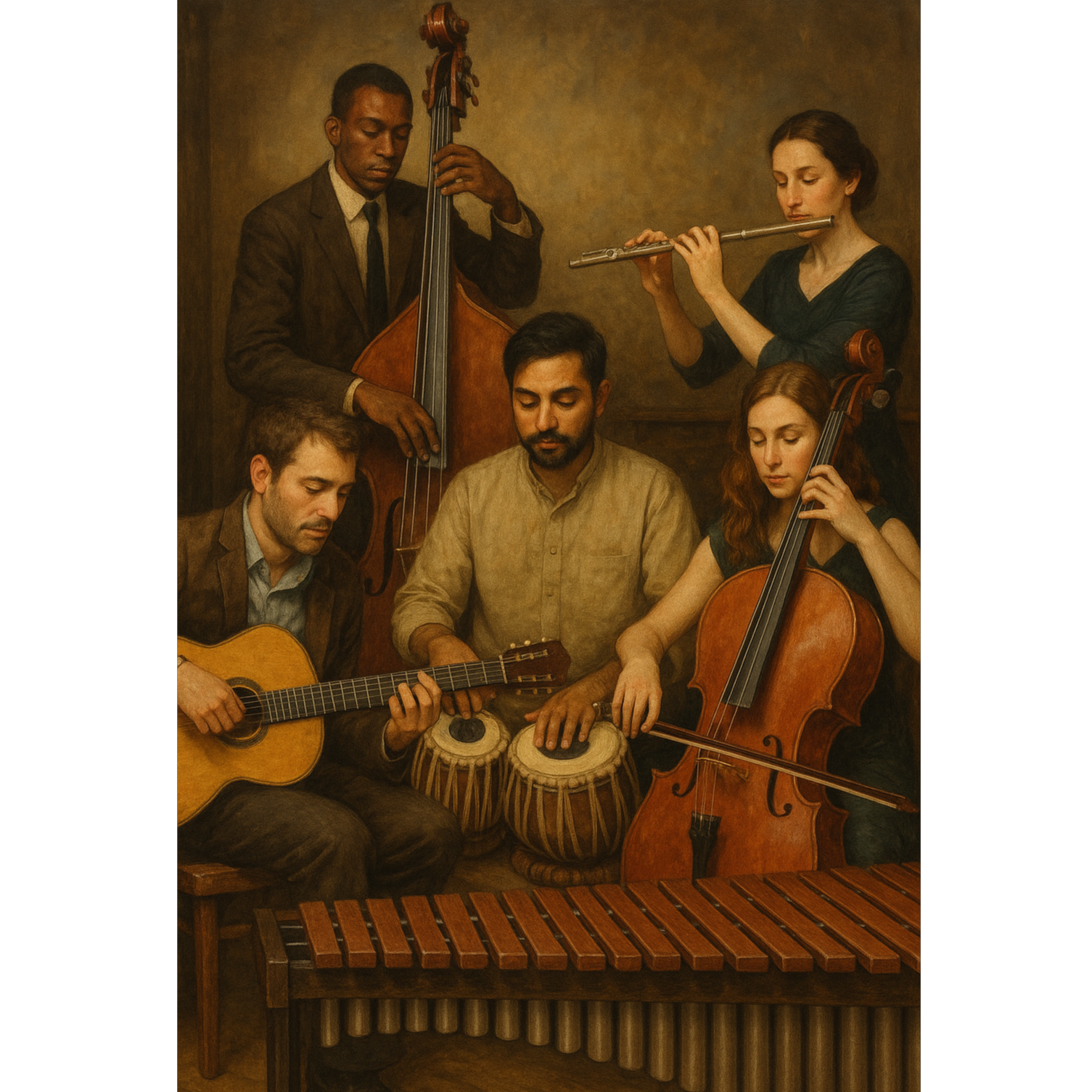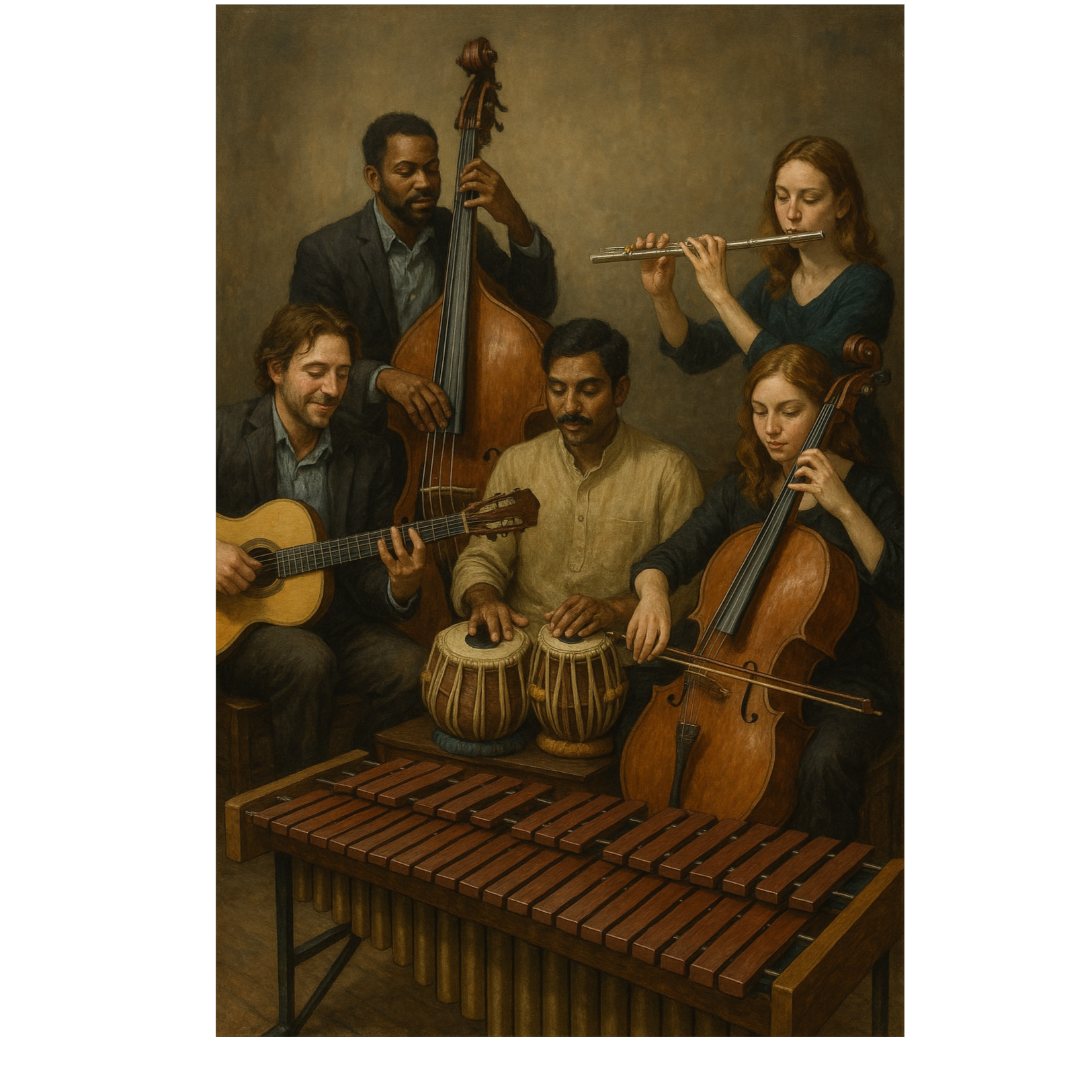 An Experimental Jazz Ensemble - featuring acoustic guitar, upright bass, Tabla drums, cello, marimba and flute - delivering this enchanting textural cinematic performance