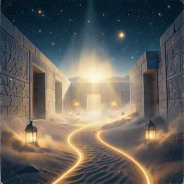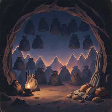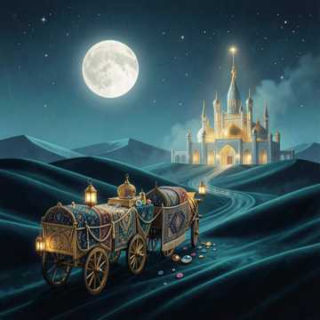 Authentic Eastern folk, storytelling tempo 80–90 BPM, fully acoustic instrumentation, traditional Middle Eastern instruments only, minimal percussion, no modern electronic instruments; instruments: oud, qanun, duduk, ney flute, kamancheh, santur, daf (softly), occasional tambourine for gentle rhythm; male and female choir / solo vocals for call-and-response; melodic phrasing based on traditional maqams; echo and reverb for cave/palace/forest ambiance; ambient desert sounds (wind, sand, camel hooves) subtly integrated; arrangement: intro — whisper + flute, verses — melodic instruments + soft vocal lines, chorus — layered choir with harmonic emphasis, break — instrumental solo highlighting oud or duduk, finale — full ensemble quietly converging, mystical and theatrical, immersive, perfect for stage adaptation of Ali Baba and the Forty Thieves