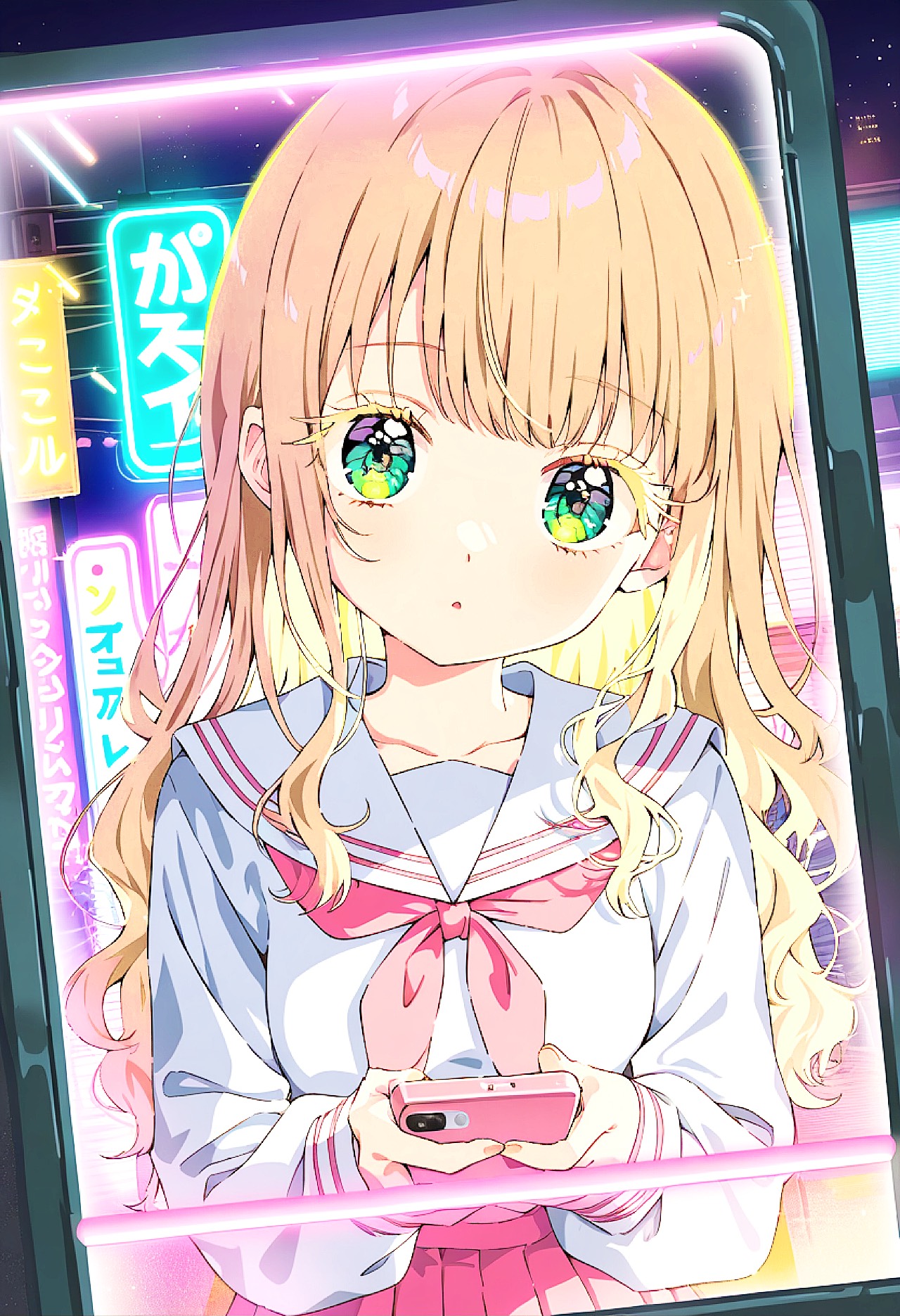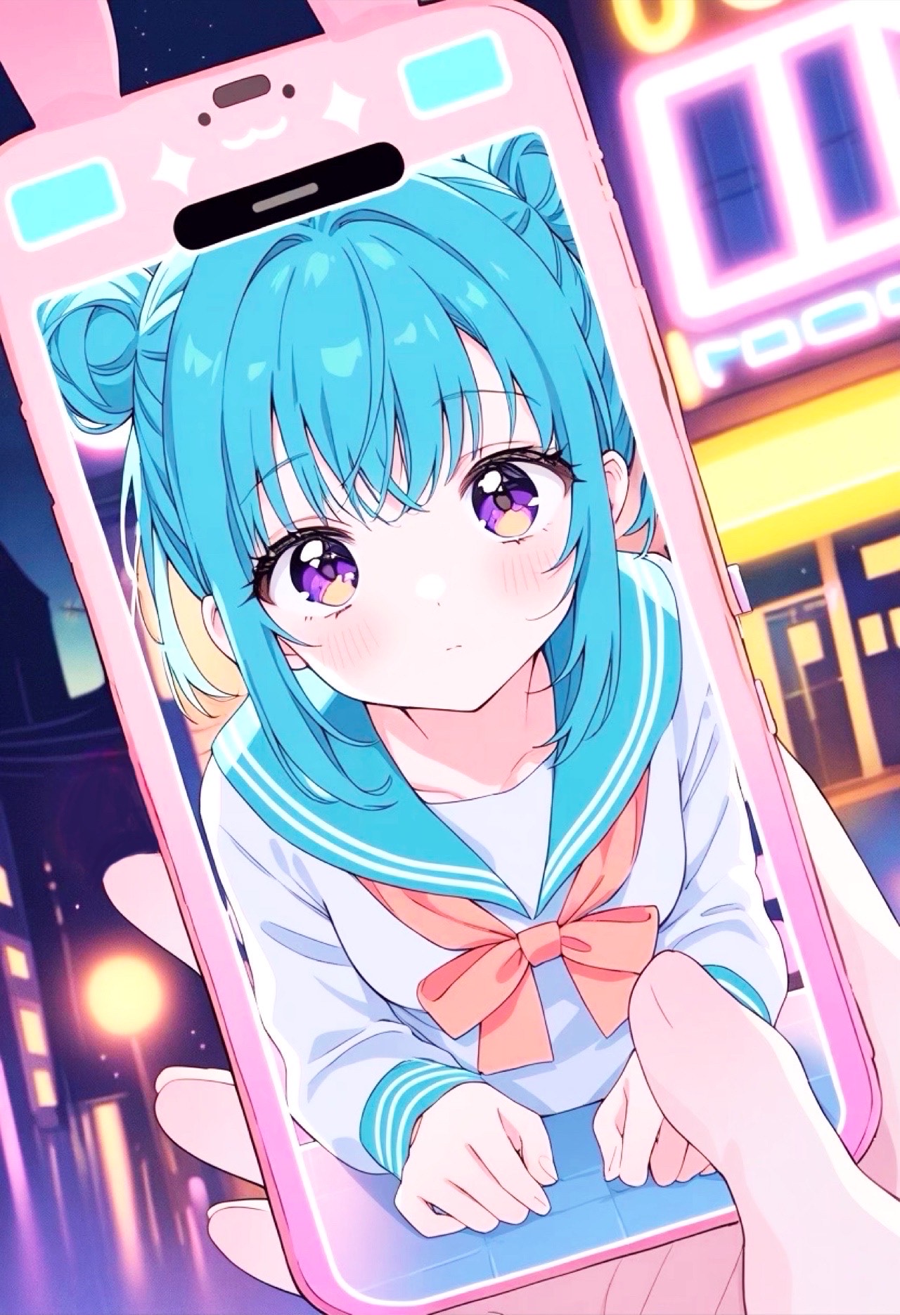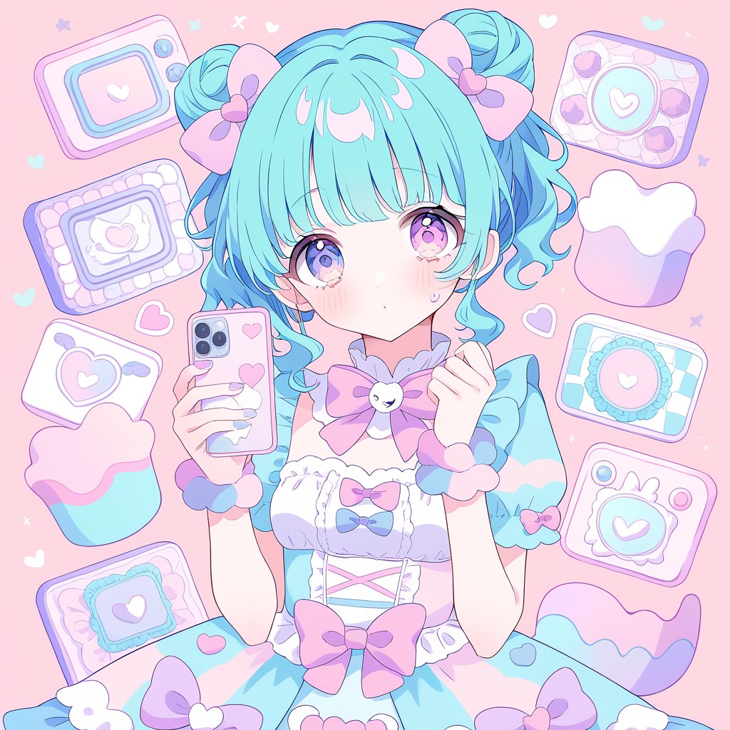 All vocal parts use a high-pitched female voice, sweet yet slightly unstable, creating a shy, heart-fluttering pop feel, The singing is playful, stuttering, hesitant, and intentionally off-pitch, expressing ambivalent emotions and unspoken love, Use city pop–influenced electronic production with warm analog synth chords, glossy pads, and neon-lit urban grooves emphasized at the front, Layer Vocaloid-style synths, digital bleeps, arpeggiators, glitchy accents, and sparkling FX, driven by a strong deep sub-bass, thick low-end, and punchy electronic kicks, In the chorus, use high-energy belted vocals, pushing the voice to its emotional limit with strained yet cute power, briefly shifting from falsetto toward chest voice, followed by light breath leaks, Add notification-like sounds and flickering synth plucks to reflect smartphone hesitation, Keep the rhythm bouncy yet sleek, Overall, the sound should feel cute, electronic, neon city-pop flavored, bass-heavy, and emotionally ambivalent