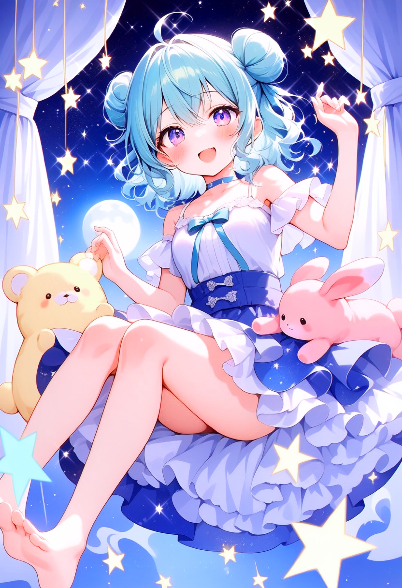 Cute and dreamy anime-style electronic pop, soft and whimsical, like plush toys dancing under a starry night, High-pitched female vocals, airy, bright, playful, and cheerful, Tempo: 120 BPM, light and bouncy rhythm, Instruments: sparkling synths, gentle bells, soft plucks, light electronic percussion, Atmosphere: magical, heartwarming, uplifting, Melody: swirling and twirling, echoing “fuwawa mofumofu” vibe, Vocal style: soft, whispery, playful, high-pitched female singing in a whimsical, cheerful tone, Include twinkling arpeggios and playful electronic embellishments, avoid heavy bass or harsh sounds, Ending: gentle melodic outro with airy vocal runs and sparkling synths, creating a soft, lingering, magical finish