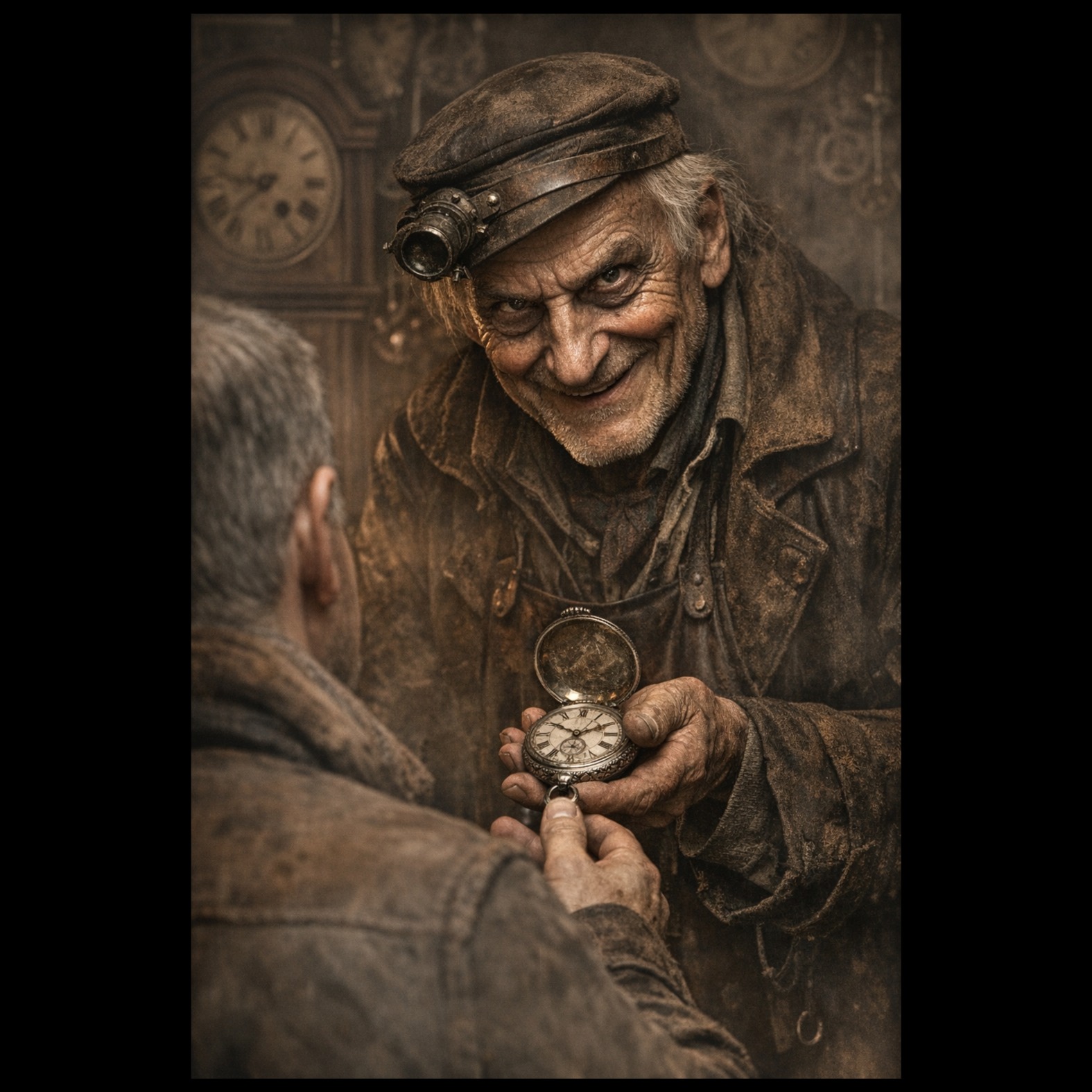 Slow, mechanical, cinematic horror score set in an old clockmaker’s workshop, Constant ticking of clocks layered in the background, metallic echoes, dusty wooden ambience, faint gear grinding, cold reverb, Dark, unsettling strings and low drones, Occasional distorted, distant male laughter (diabolical, youthful) mixed with soft, trembling breaths of fear, Atmosphere of stolen time, obsession, and despair, Suspenseful, eerie, psychological horror mood with a vintage mechanical edge