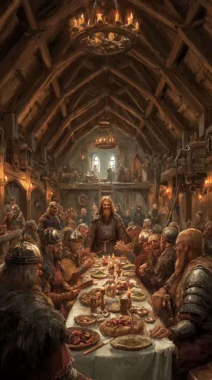 Clean electric guitar melody in Nordic minor scale, Deep tom drums, sub bass undercurrent, light string pads, Male lead vocals, Low ethereal female voice floats above, dreamy, interweaving softly between lines, Cinematic Viking metal style, tension building from intro, Full distorted guitars, Fast double kick drums, Choir chanting rhythmically, Brass accents, Male vocals on lyrics, Low ethereal female voice floats above chorus, haunting, reverent, weaving through lines, Epic cinematic metal energy, Layer orchestral strings and pads for Viking battlefield fee