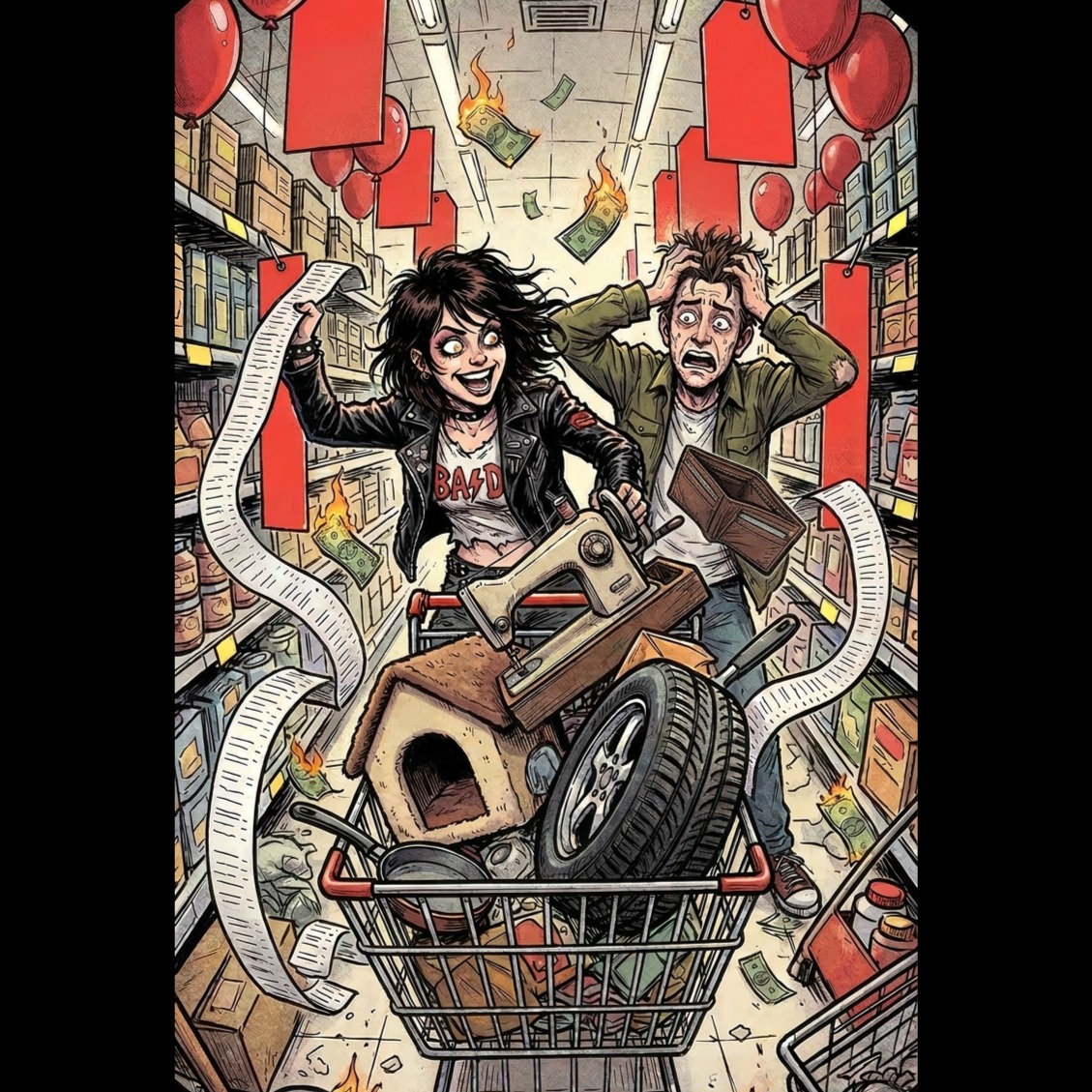 British garage punk, high-octane indie rock, overdriven guitar, heavy dirty bass, rhythmic recitative, aggressive stomping chorus, dark comedy, fast driving drums