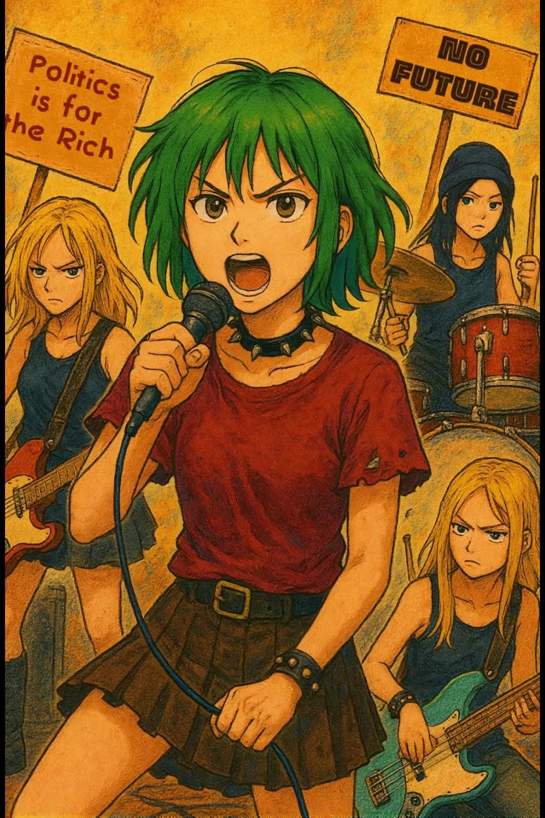 female lead vocal, revolutionary female spoken-word vocals with punk and hip-hop elements, powerful high-pitch lyricism, Punk-Rock, Punk-metal, distorted guitars, driving slap bass, deep drums
