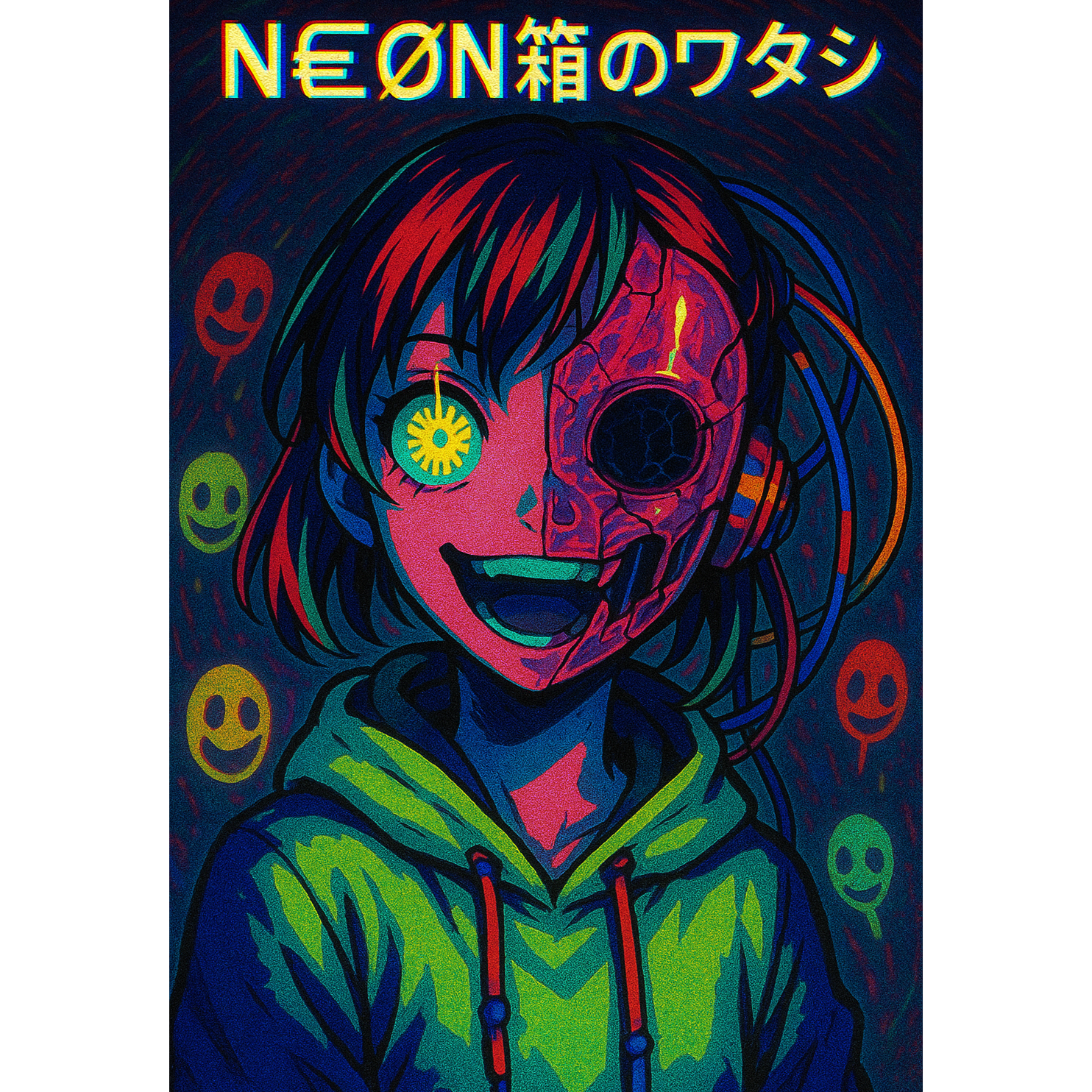 A hyper-speed experimental Vocaloid-style track inspired by Matryoshka: chaotic, psychedelic, and philosophical, Tempo: 180 BPM, Genre blend: electropunk, glitch-pop, vocaloid rock, experimental J-pop, Instrumentation: distorted drumkit, 8-bit glitches, dissonant synth arps, metallic percussion, mechanical bassline, layered robotic choirs, whisper FX, and toybox melodies, Vocals: extremely fast, playful, alternating between cute insanity and existential despair; dual voices with robotic harmonization, occasional whispers and glitches, Mood: surreal, manic, introspective, colorful, dangerous, Lyrical themes: identity loss, digital existence, consciousness, philosophy, illusion, AI dreams, chaos, Mix: intense stereo panning, bursts of distortion, vocoder breaks, and sudden silence cuts, Overall aesthetic: cyber-carnival inside a neon brain — vivid, glitchy, and self-aware